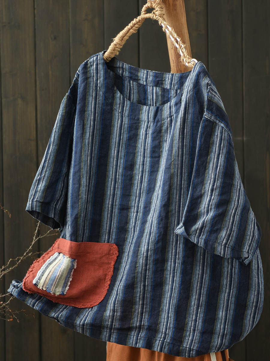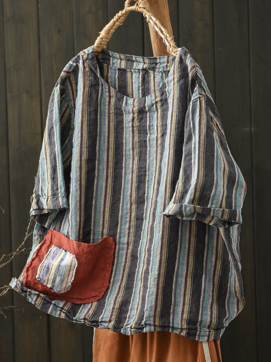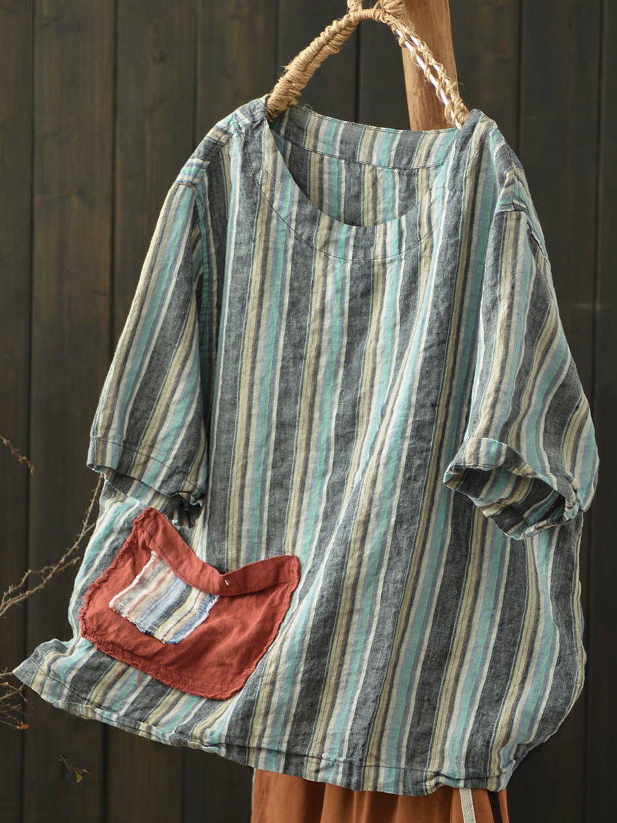 Women Summer Vintage Stripe O-Neck Linen Shirt