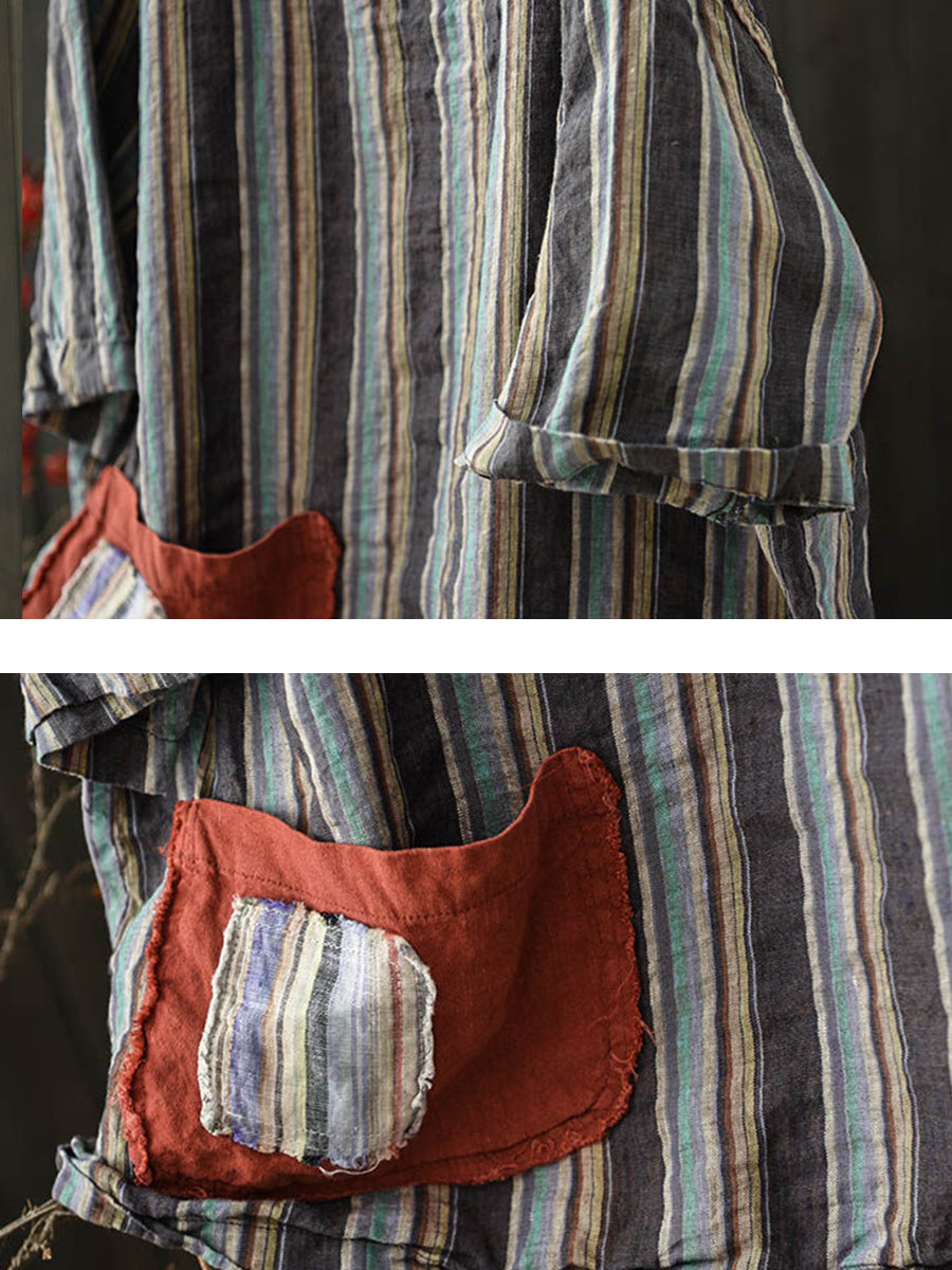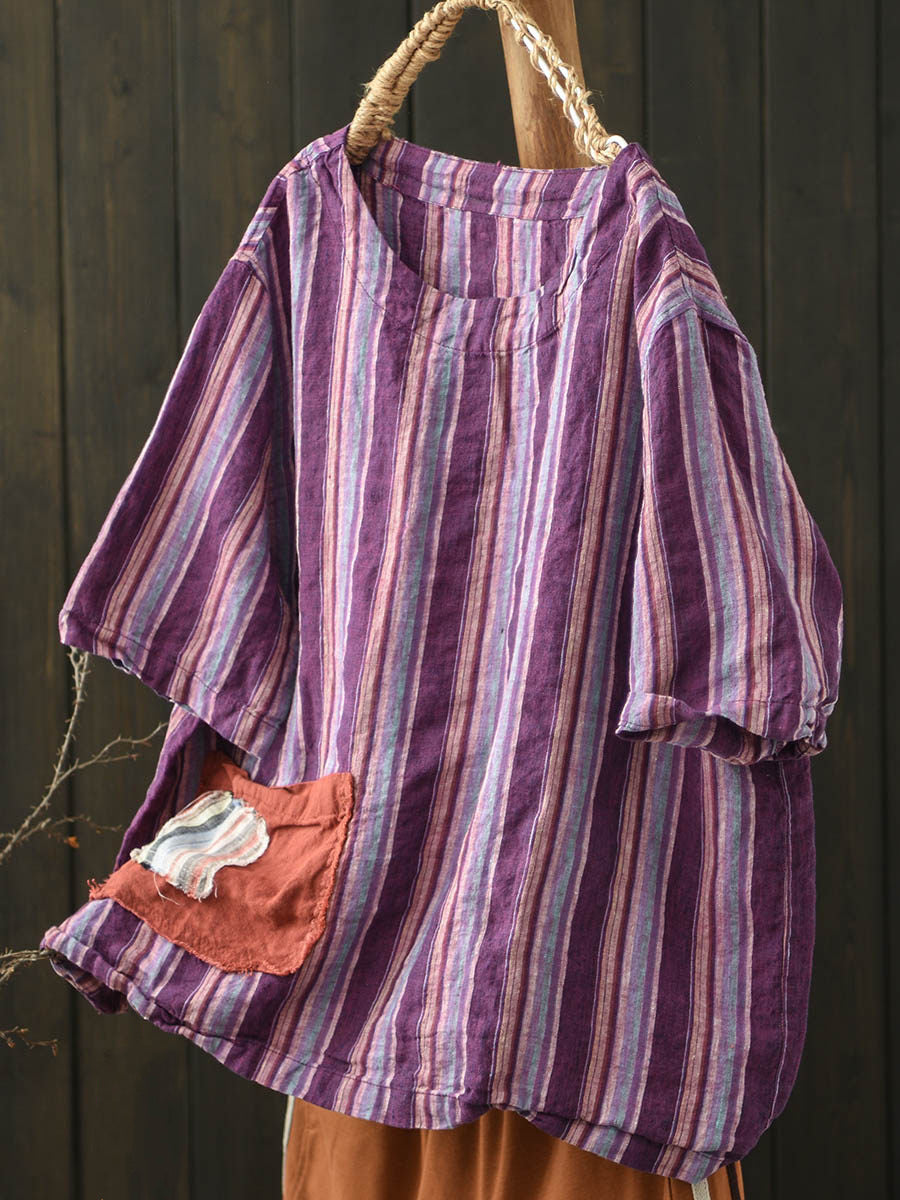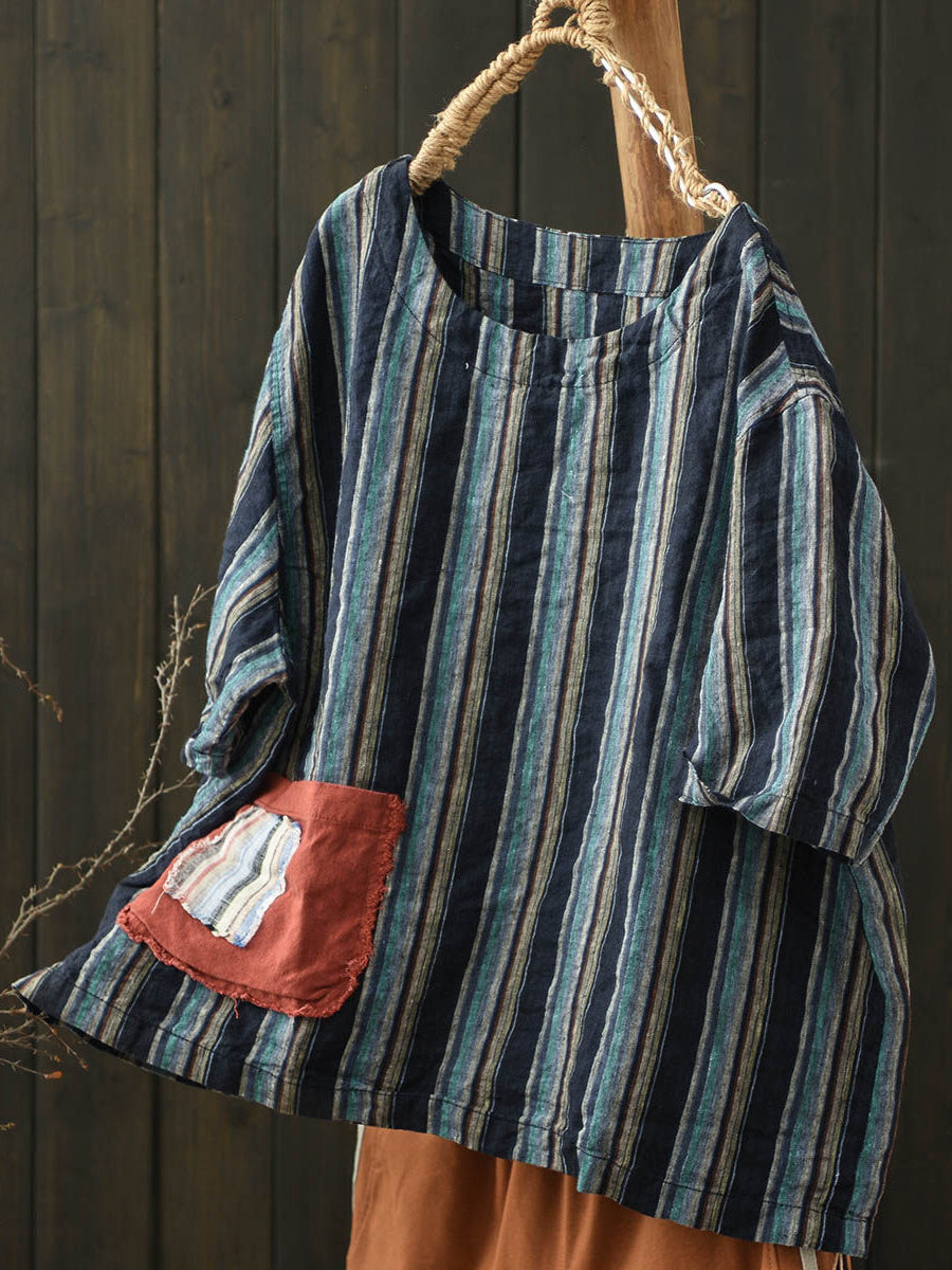 Women Summer Vintage Stripe O-Neck Linen Shirt