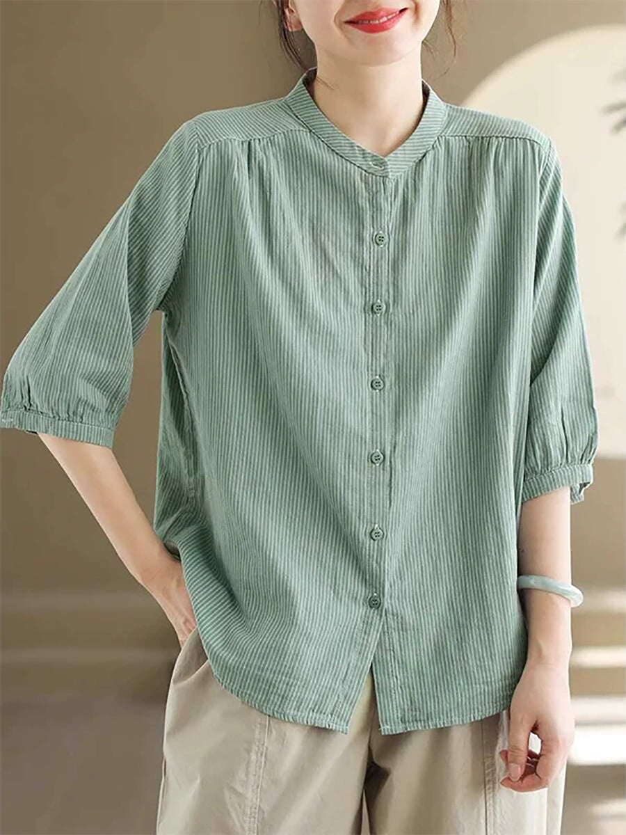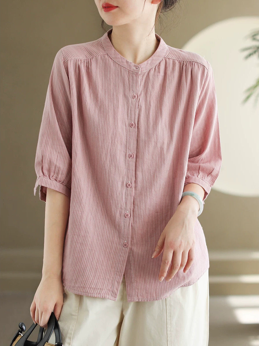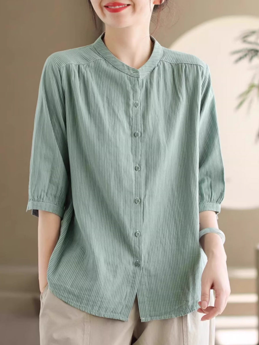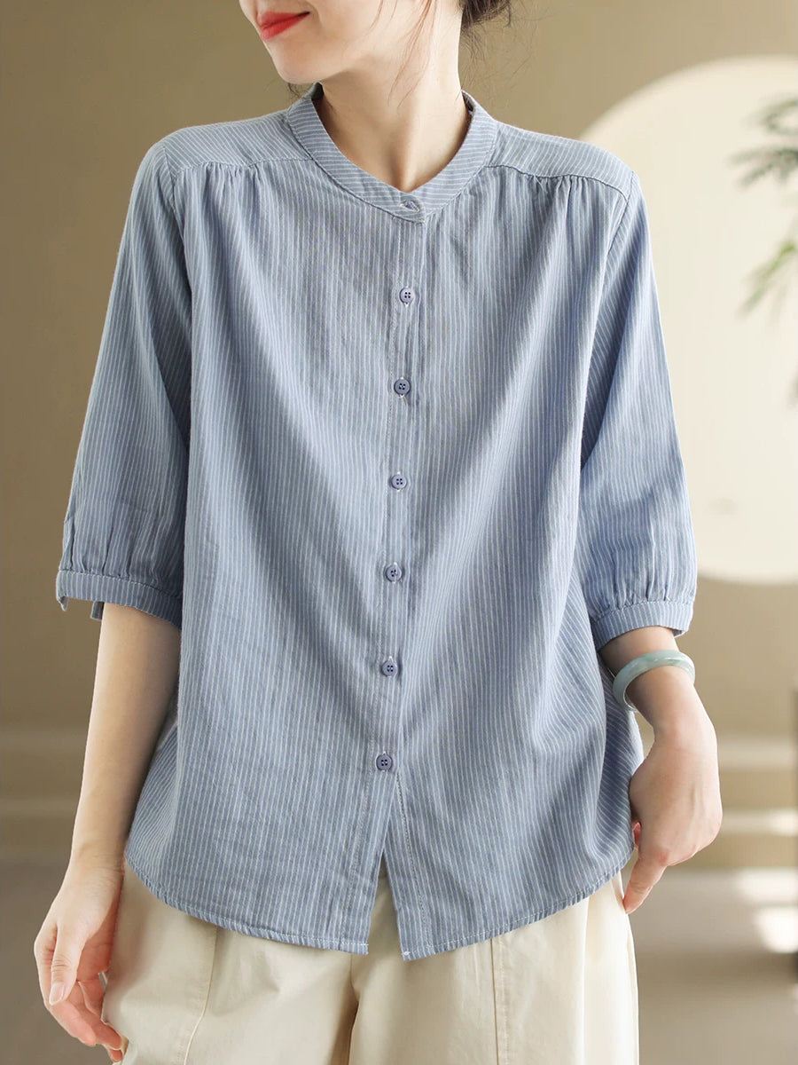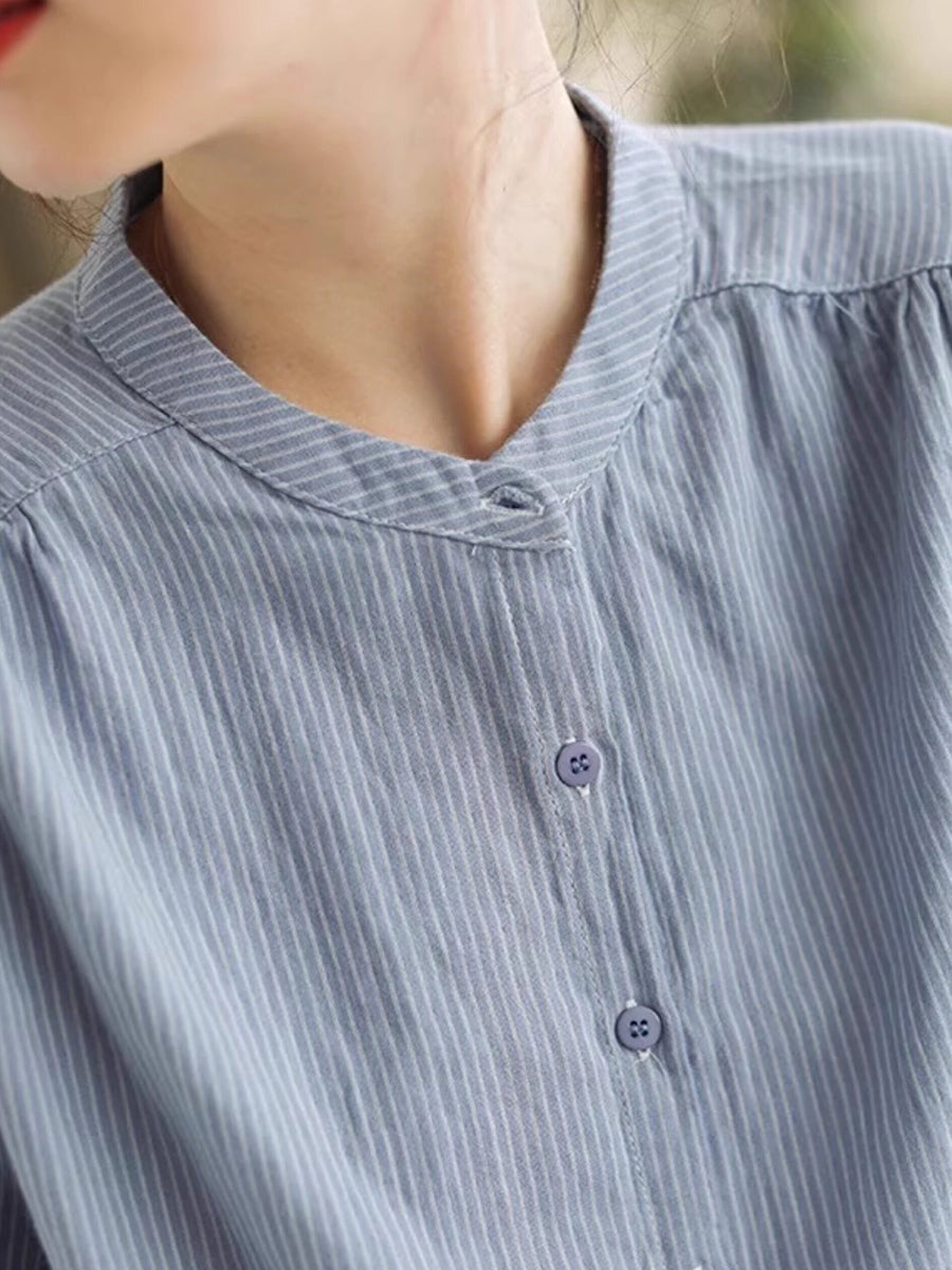 Women Summer Vintage Stripe Stand Collar 100%Cotton Shirt