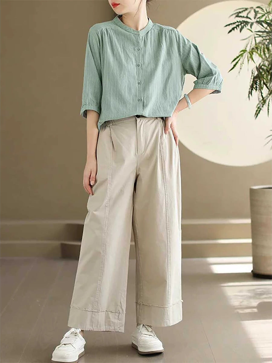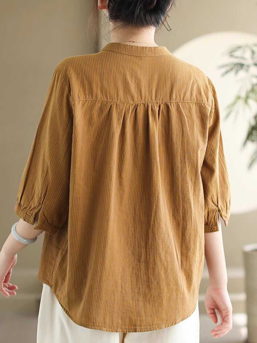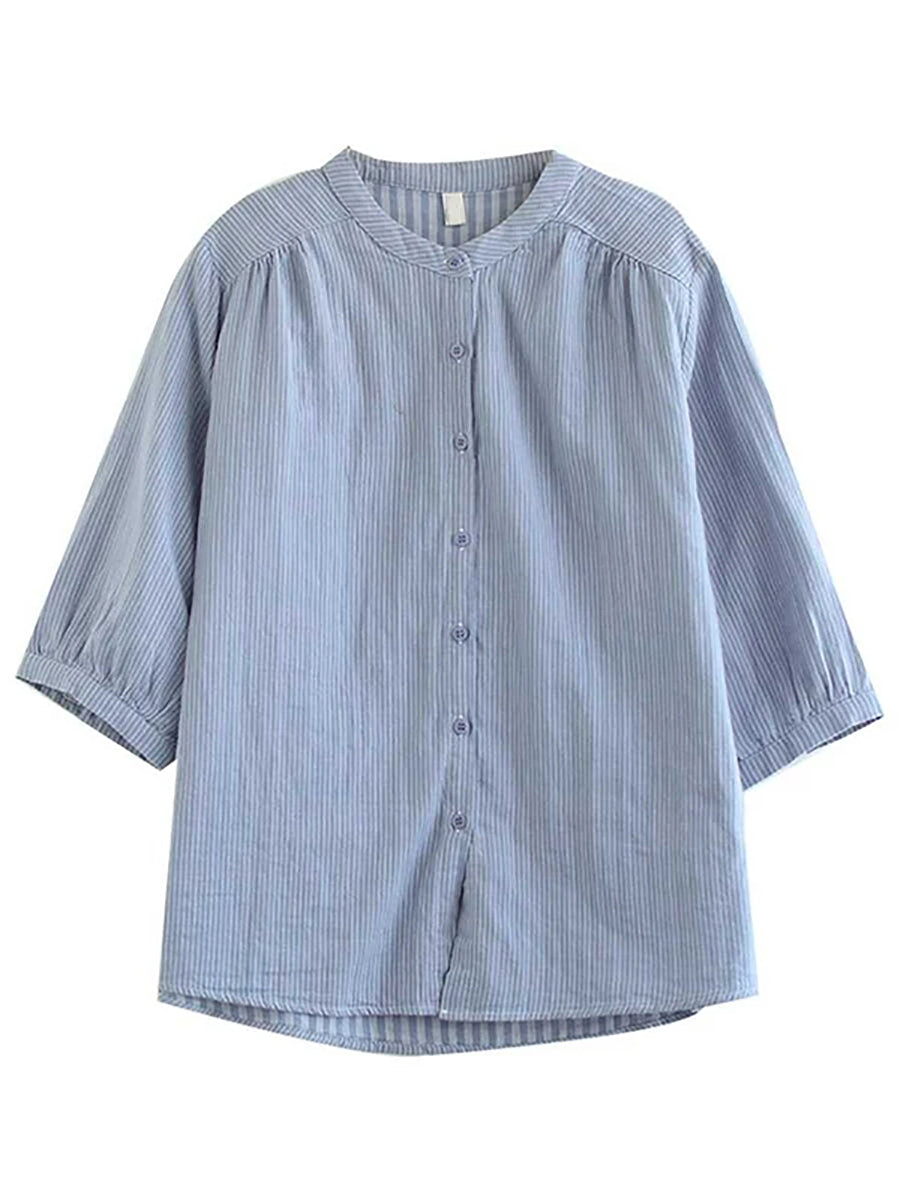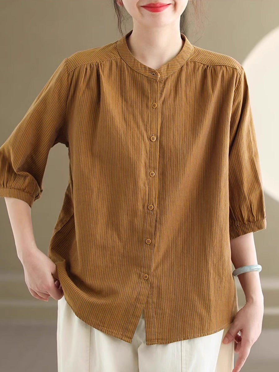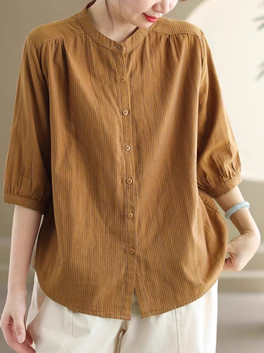 Women Summer Vintage Stripe Stand Collar 100%Cotton Shirt