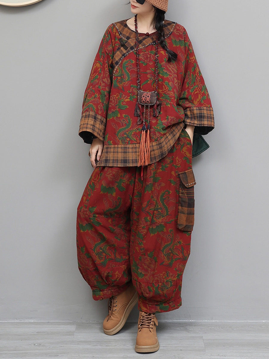 Women Winter Retro Flower Plaid Spliced O-Neck Padded Suits