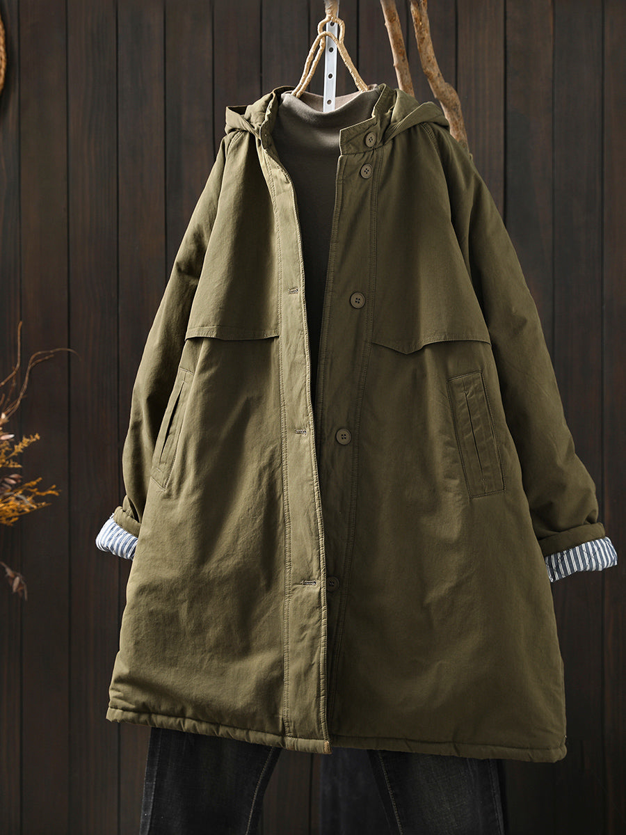 Women Winter Retro Pure Color Hooded Padded Coat