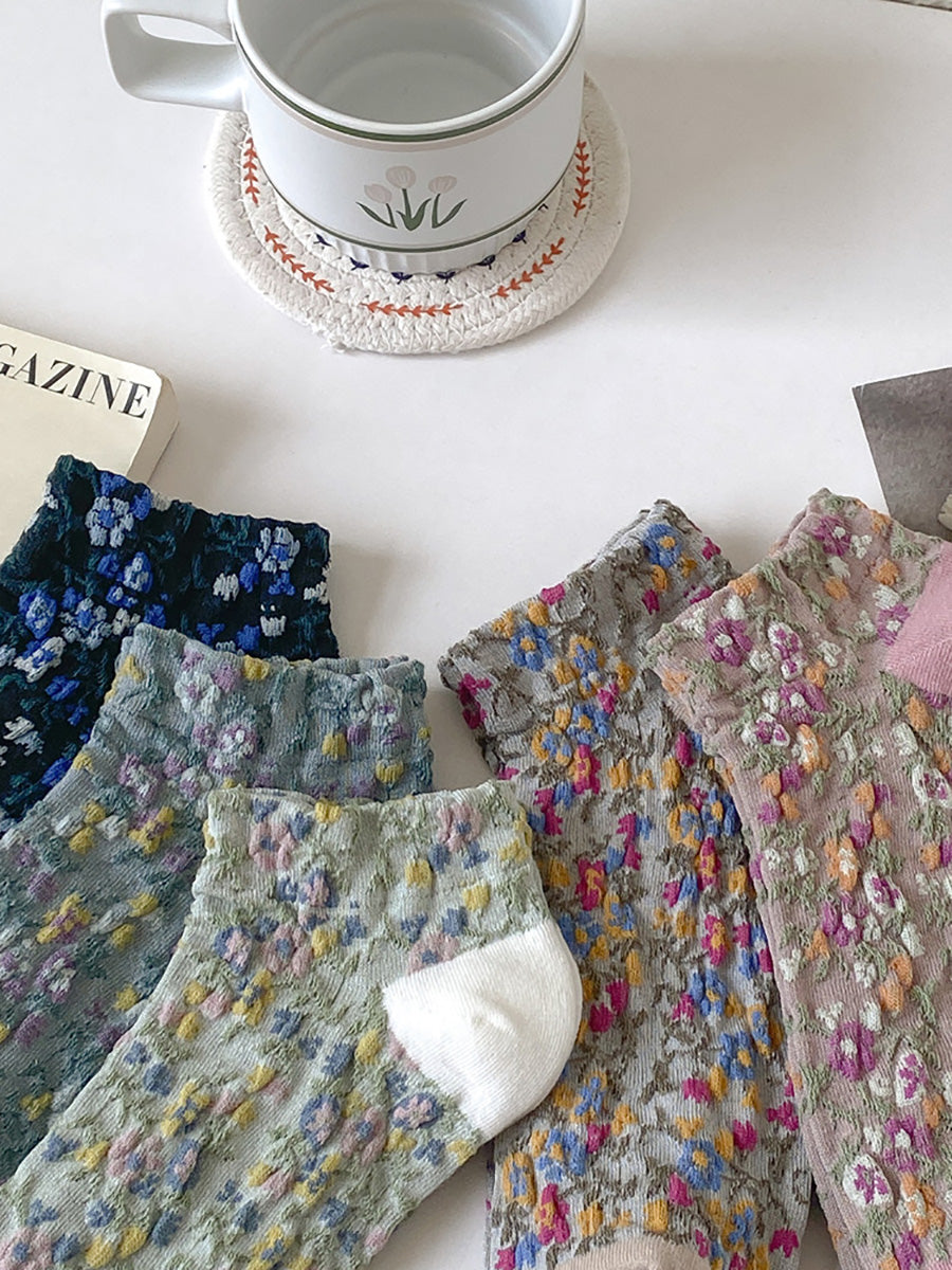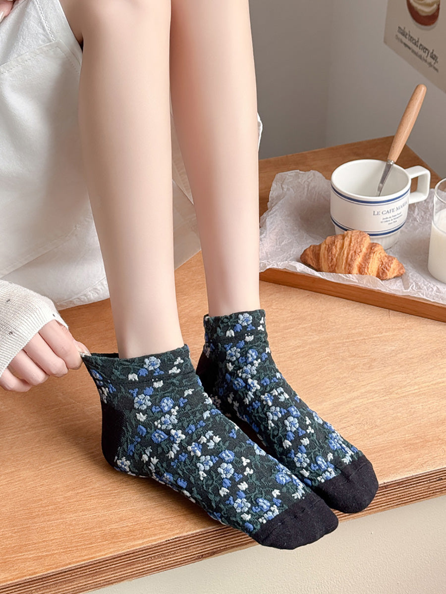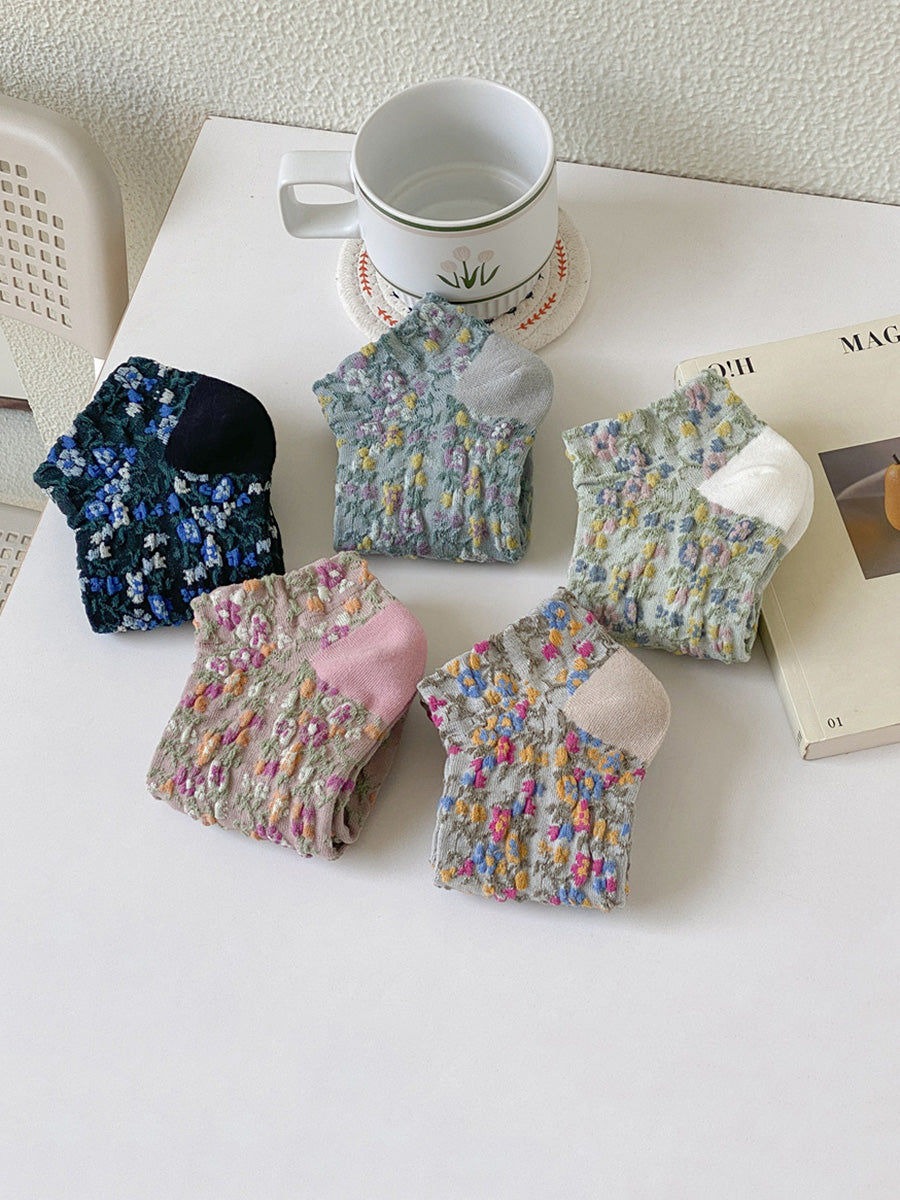 5 pares de calcetines cortos con estampado floral artístico de jacquard y bloques de color para mujer