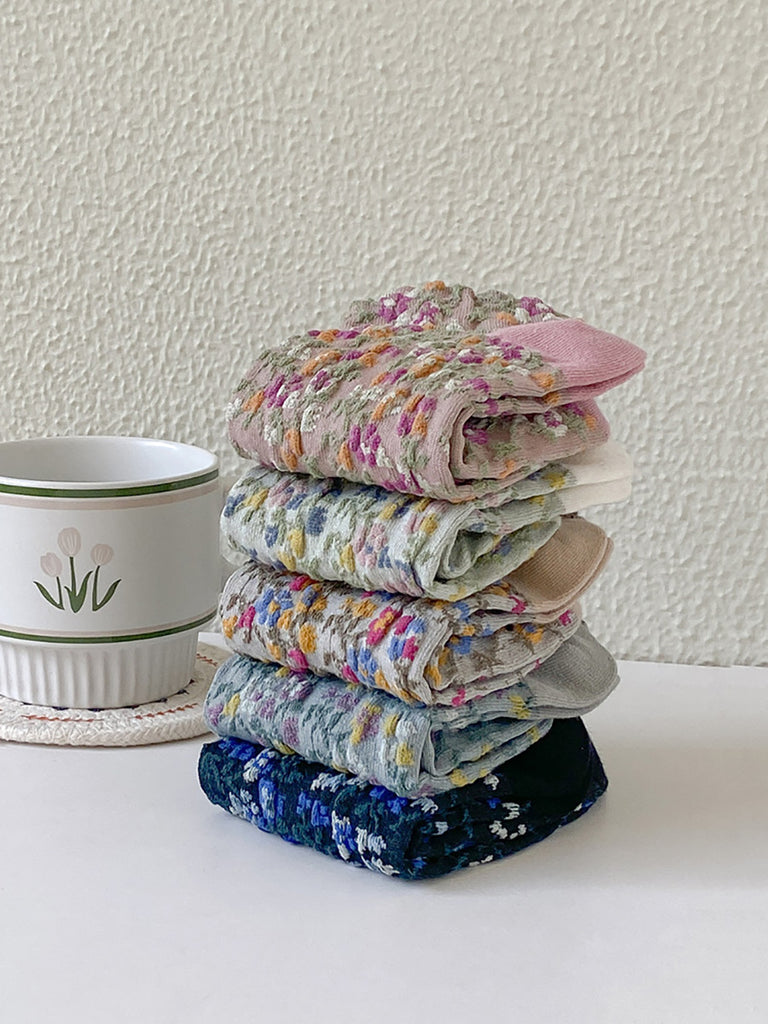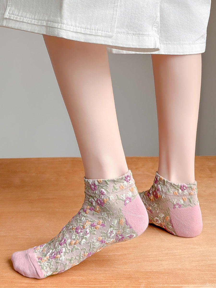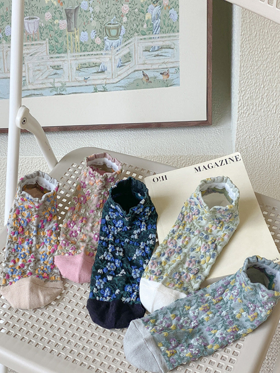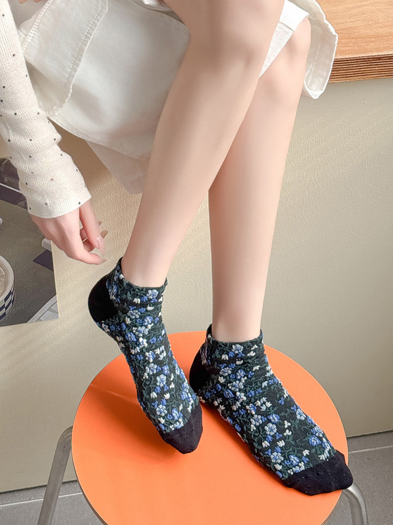 5 pares de calcetines cortos con estampado floral artístico de jacquard y bloques de color para mujer
