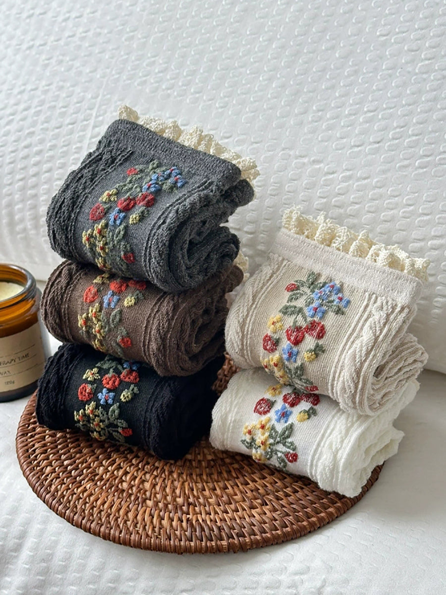 5 pares de calcetines de encaje de punto con flores artísticas para mujer