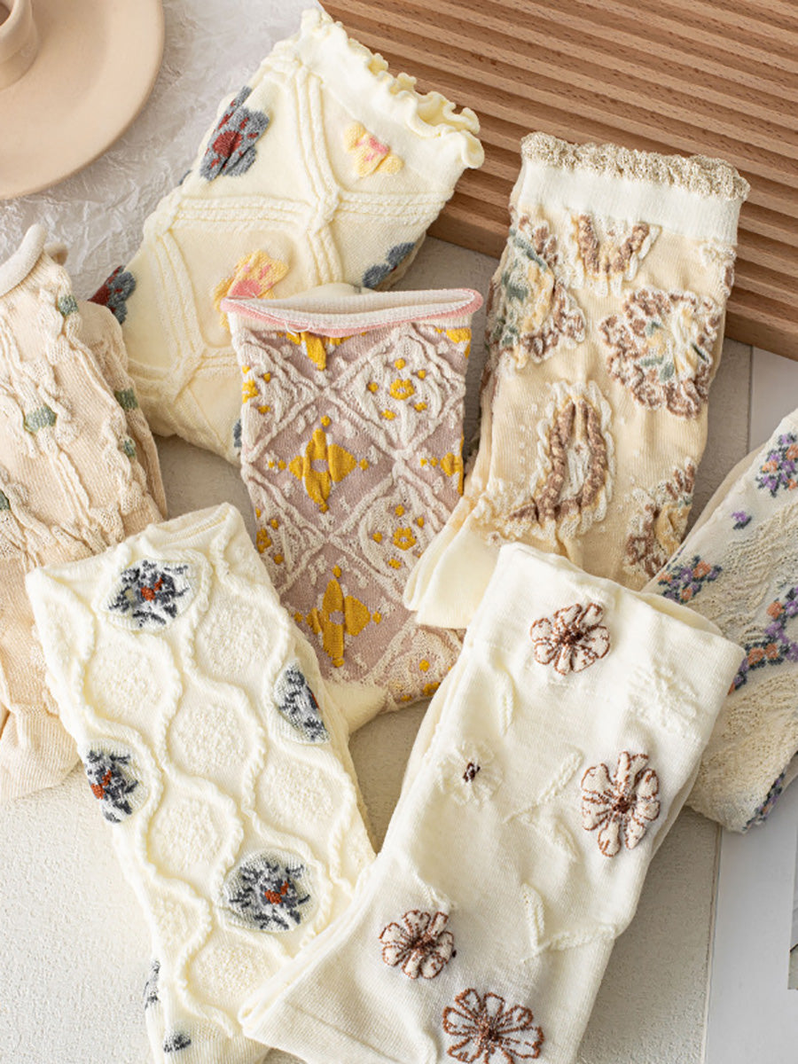 7 pares de calcetines de jacquard con flores artísticas para mujer