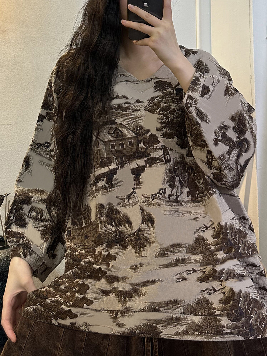 Camisa de manga larga con cuello en V y estampado vintage para mujer de talla grande