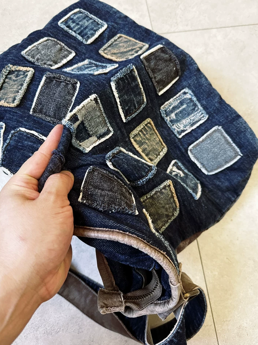 • Material: Tela vaquera desgastada, cuero;