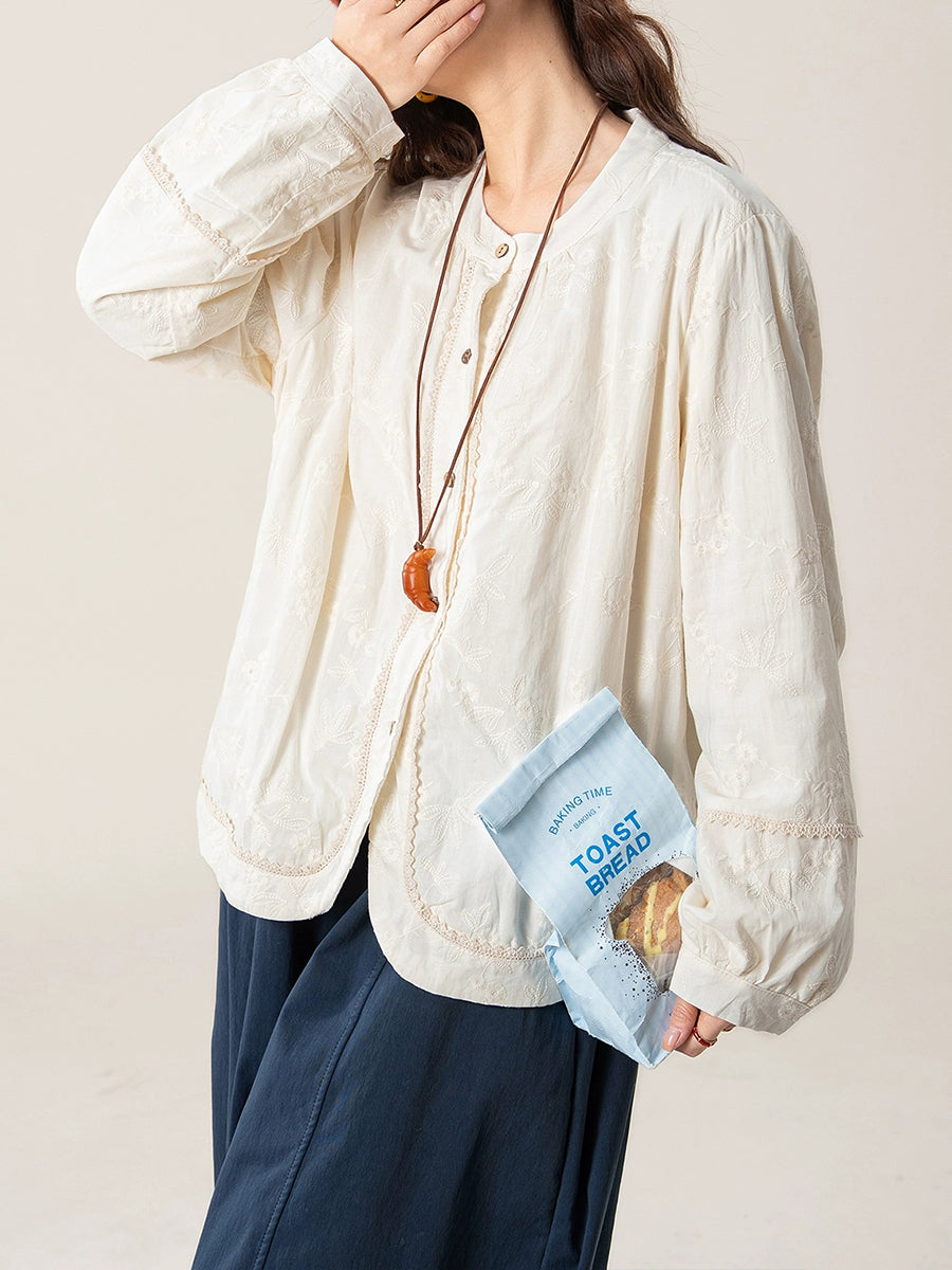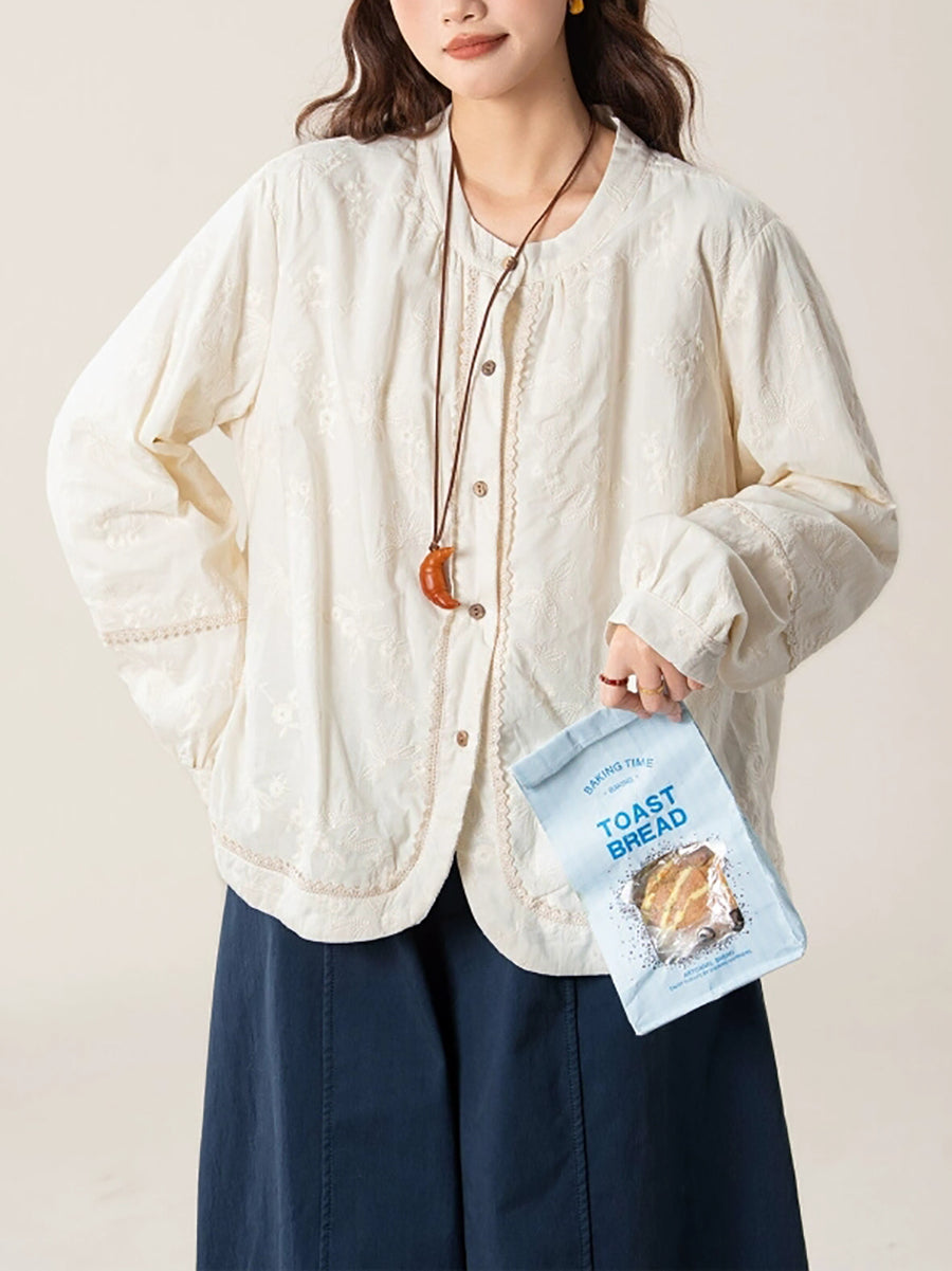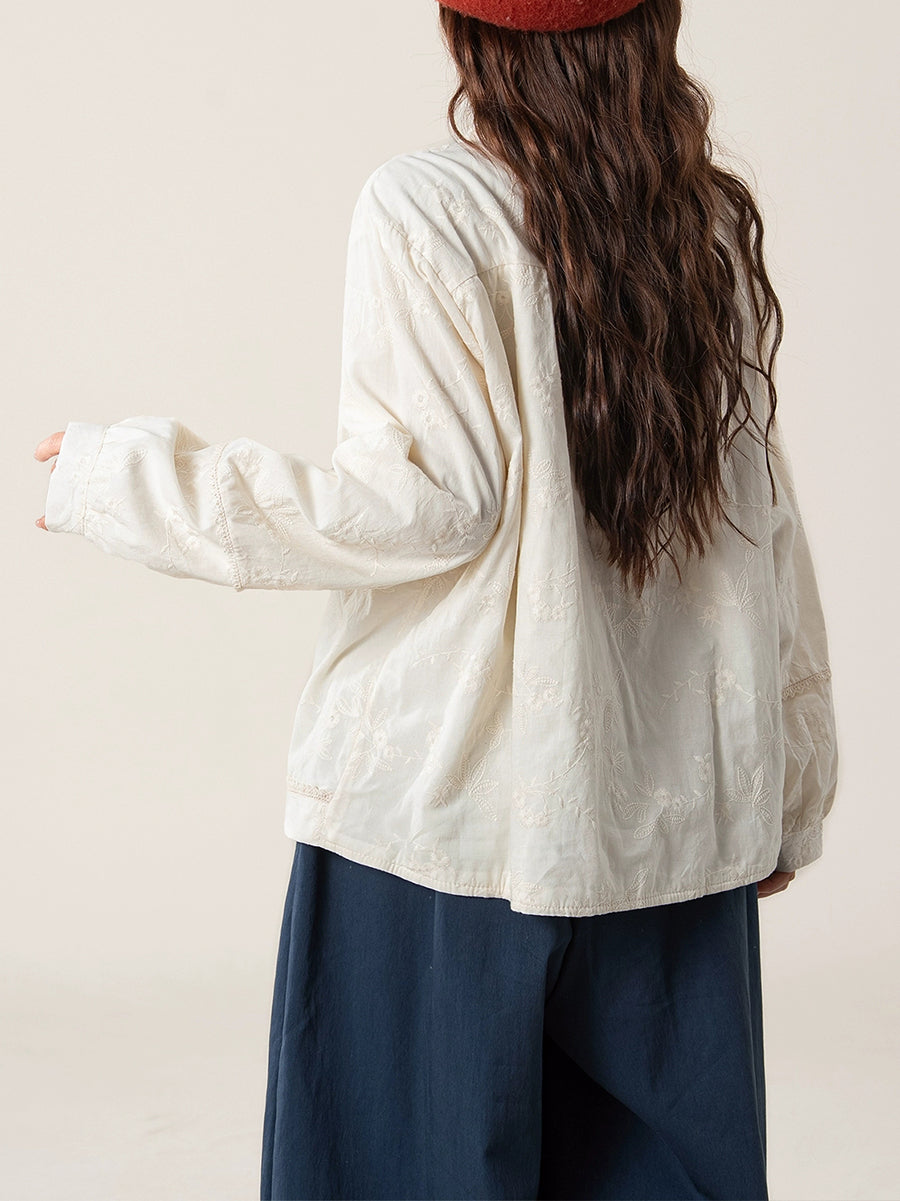 Camisa de cuello redondo con bordado artístico otoñal para mujer