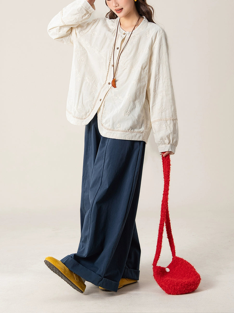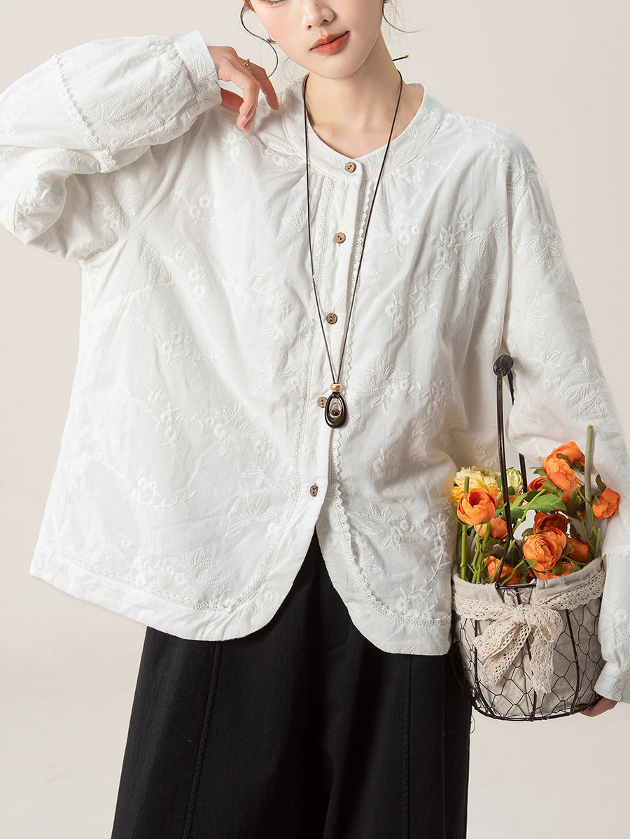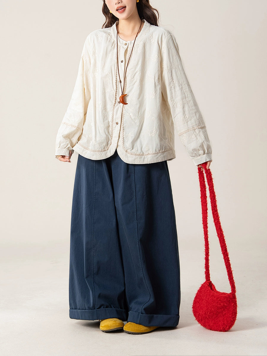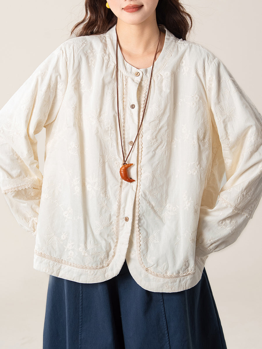 Camisa de cuello redondo con bordado artístico otoñal para mujer