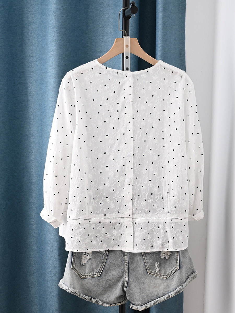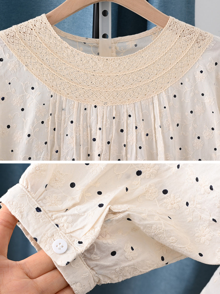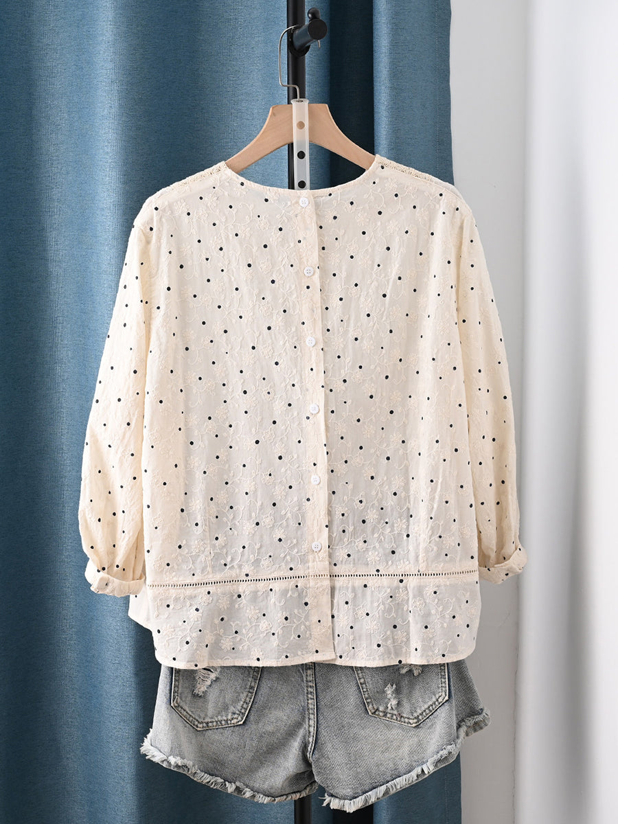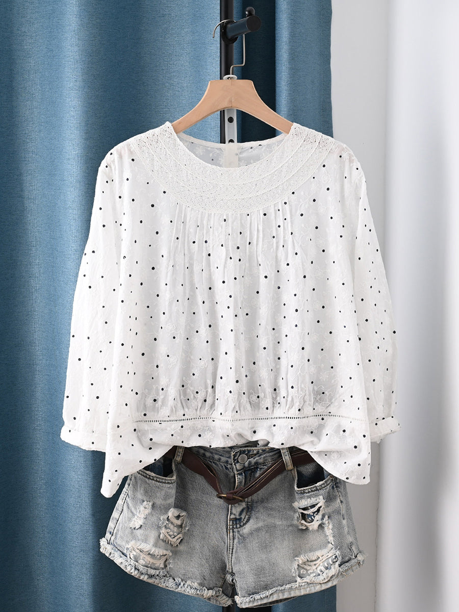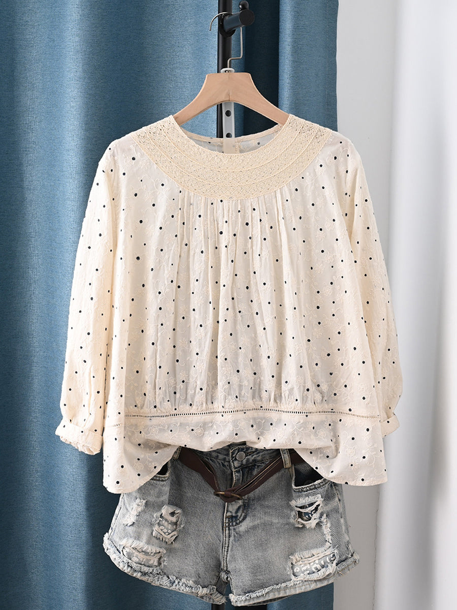 Blusa de mujer con encaje bordado de lunares, 100 % algodón, estilo Artsy Spring