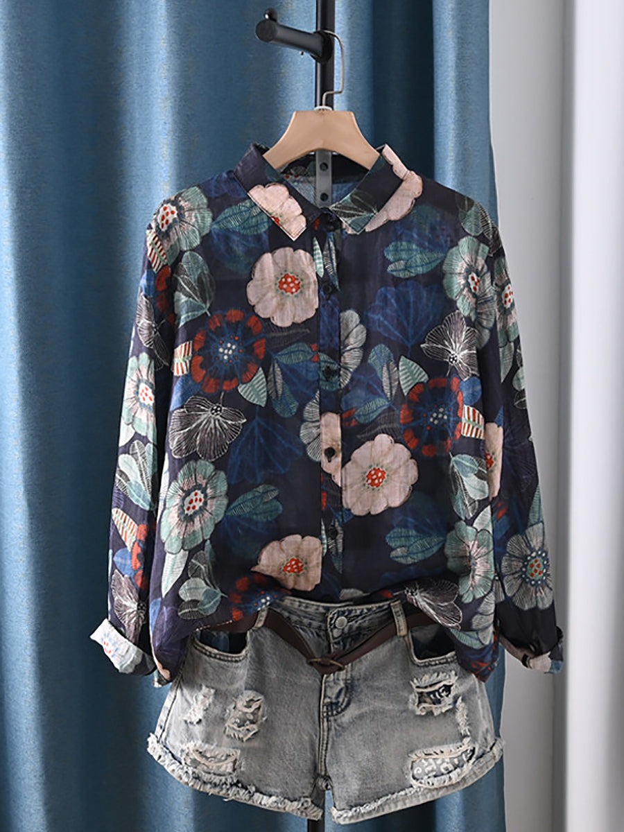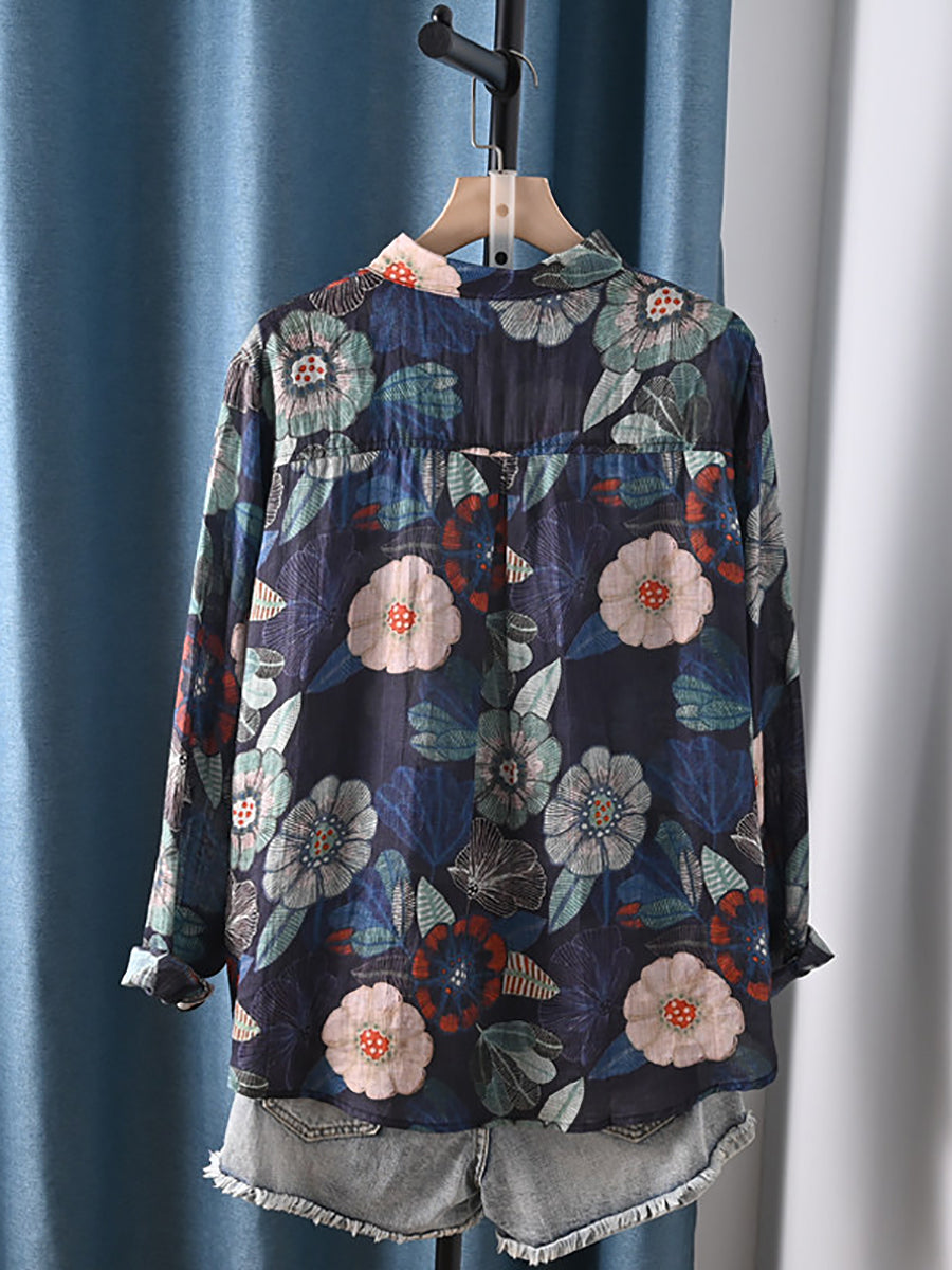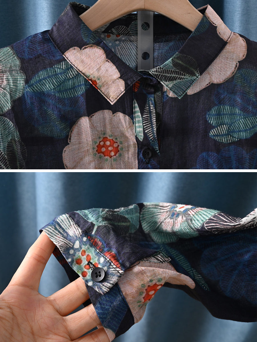 Camisa 100 % ramio con flores primaverales artísticas para mujer