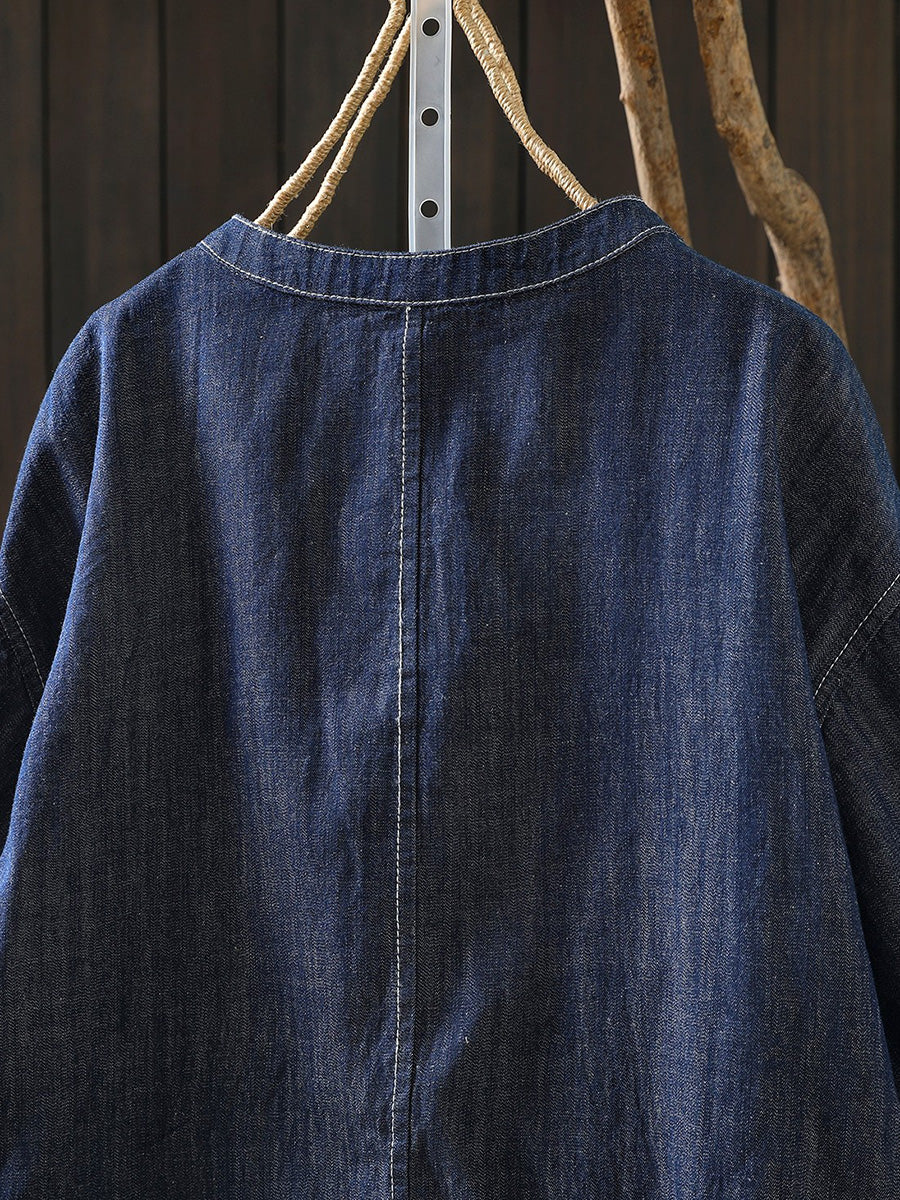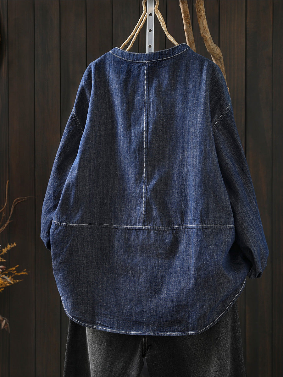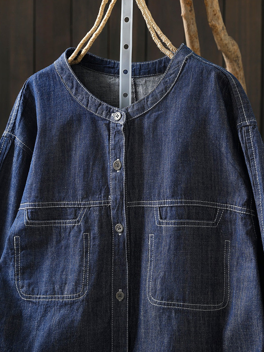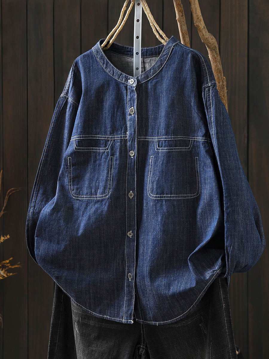 Camisa vaquera de cuello redondo de color puro y estilo artístico para mujer