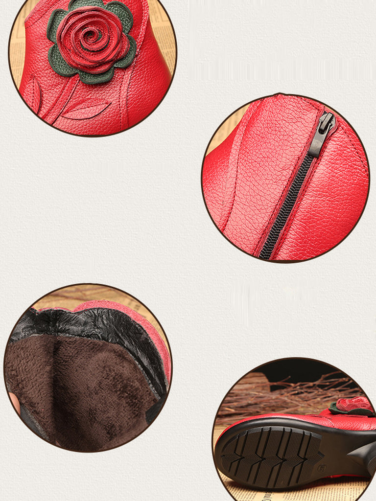 Botas de tacón medio de cuero con flores artísticas de otoño para mujer