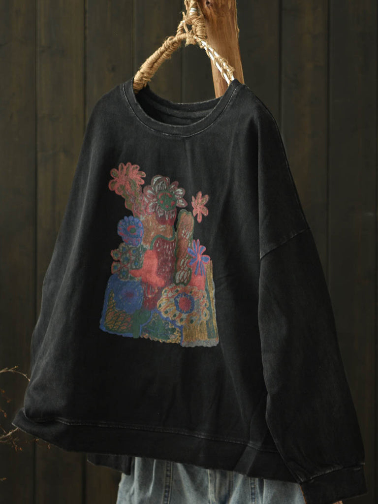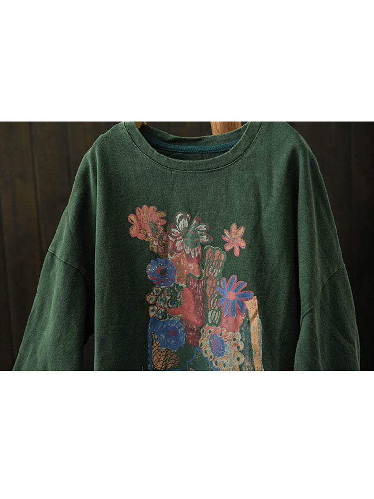 Blusa de algodón con cuello redondo y flores artísticas de otoño para mujer