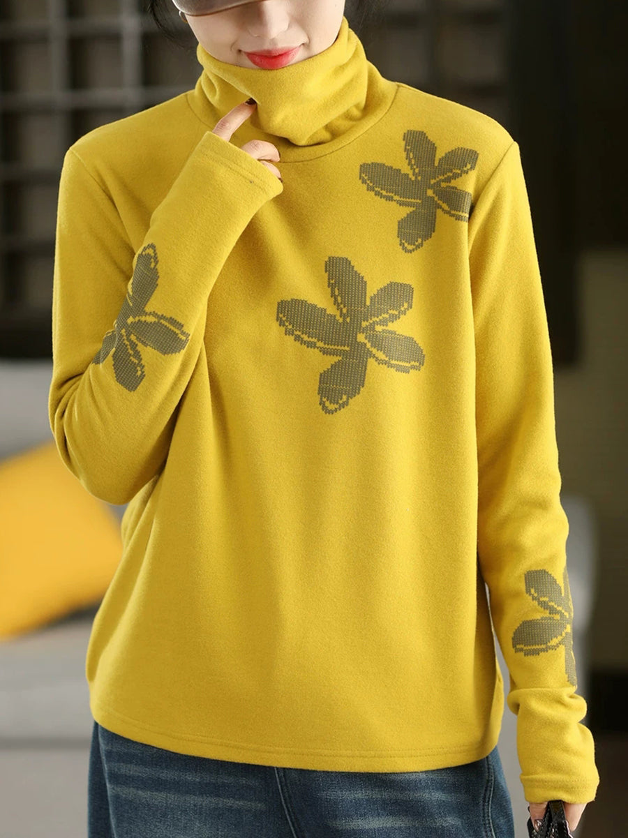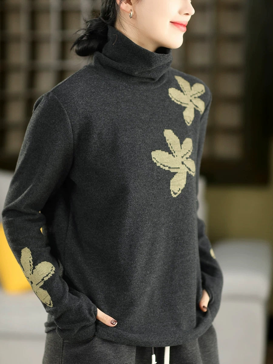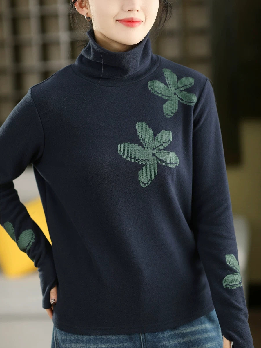 Suéter de cuello alto con flores artísticas de otoño para mujer