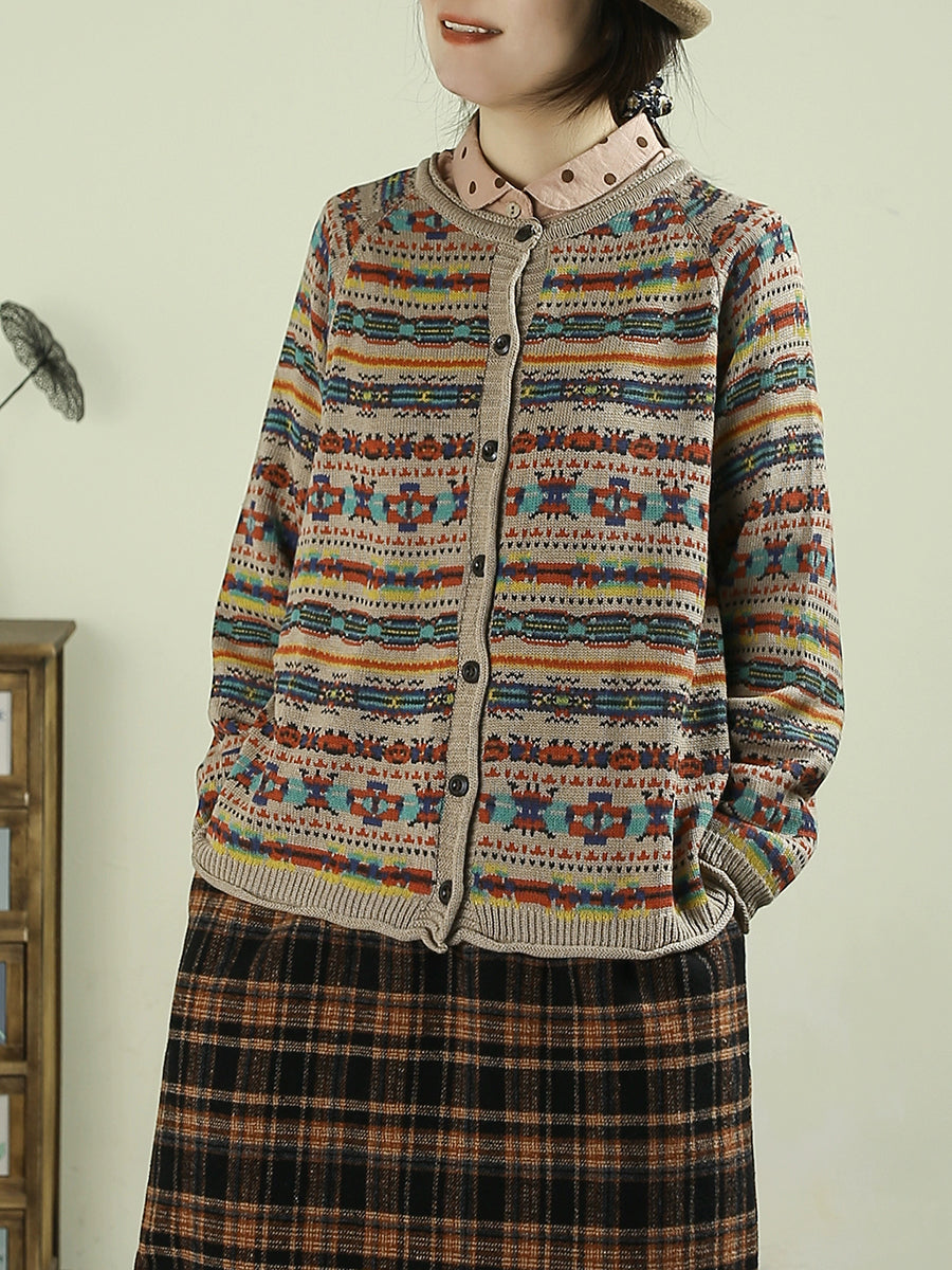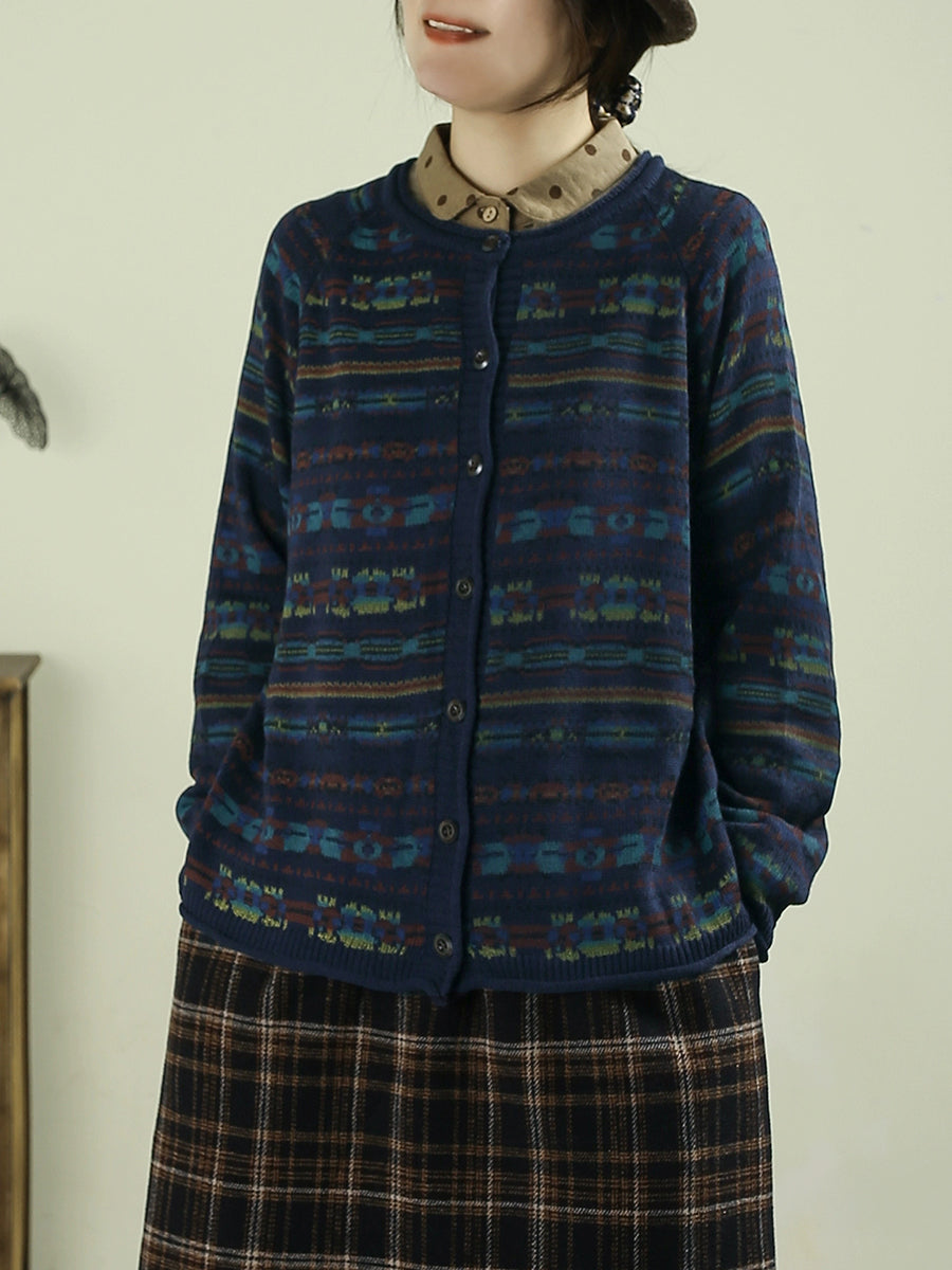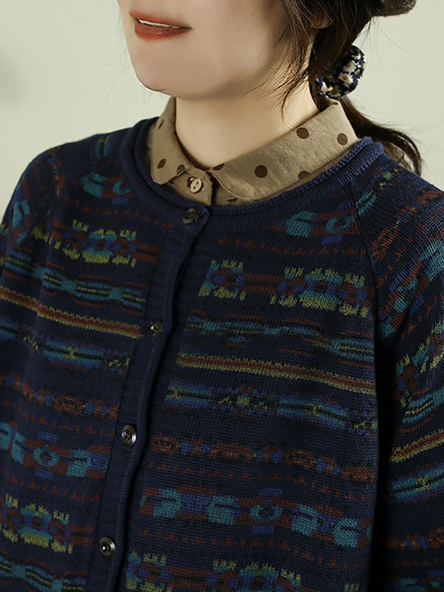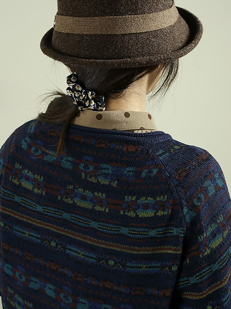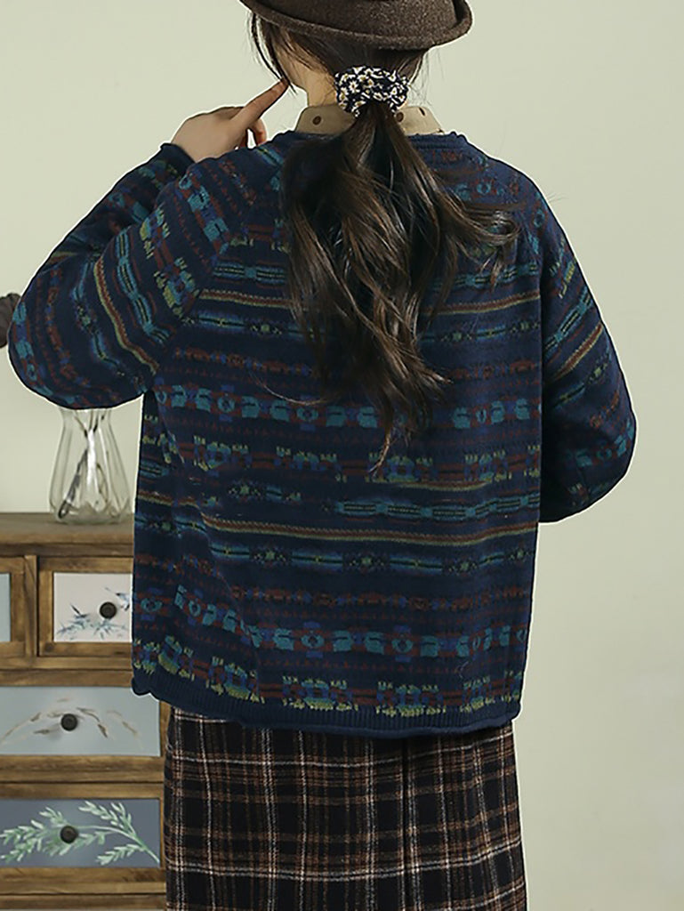 Suéter de punto con cuello redondo y rayas artísticas de otoño para mujer