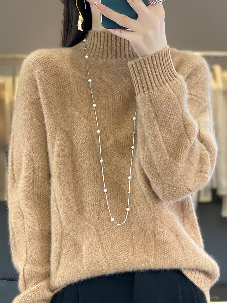 Este suéter, confeccionado con 100 % lana, presenta un patrón liso y cuello redondo. Las mangas son largas y tienen un corte raglán, perfecto para usar de manera informal durante las temporadas de invierno y otoño.