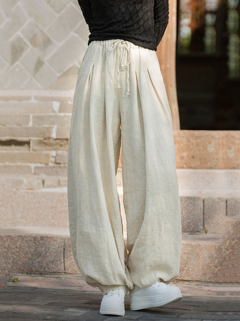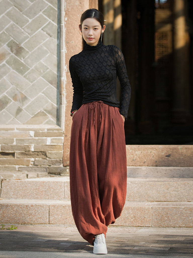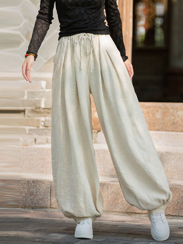 Pantalones bombachos holgados de ramio liso vintage de otoño para mujer