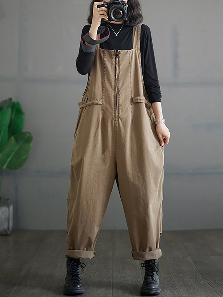 Monos casuales holgados de color liso con cremallera vintage de otoño para mujer