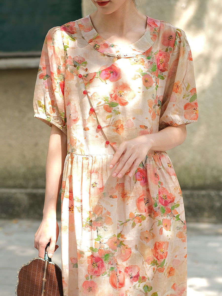 Este vestido de ramio de estilo chino te mantendrá fresco con su tejido ligero y transpirable y su silueta drapeada. La adición de un cuello clásico y detalles de botones le dan un toque de elegancia, convirtiéndolo en la elección perfecta para las celebraciones de verano.