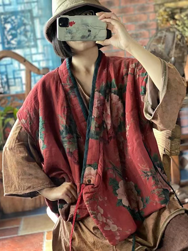 Chaleco holgado vintage de algodón con estampado floral para mujer