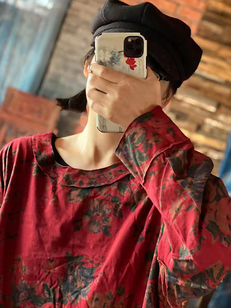 Camiseta holgada de manga larga vintage floral de algodón para mujer de talla grande