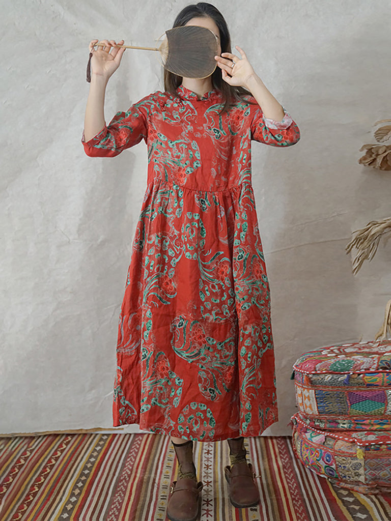 Vestido floral estampado vintage de lino de talla grande para mujer