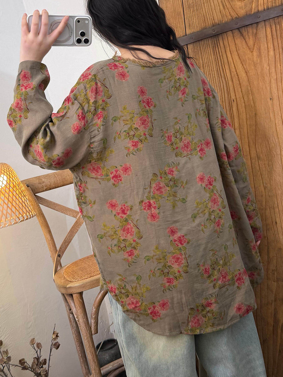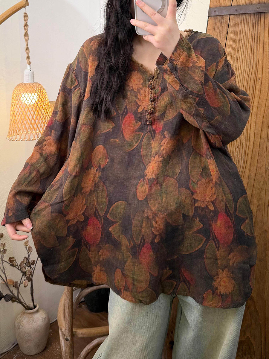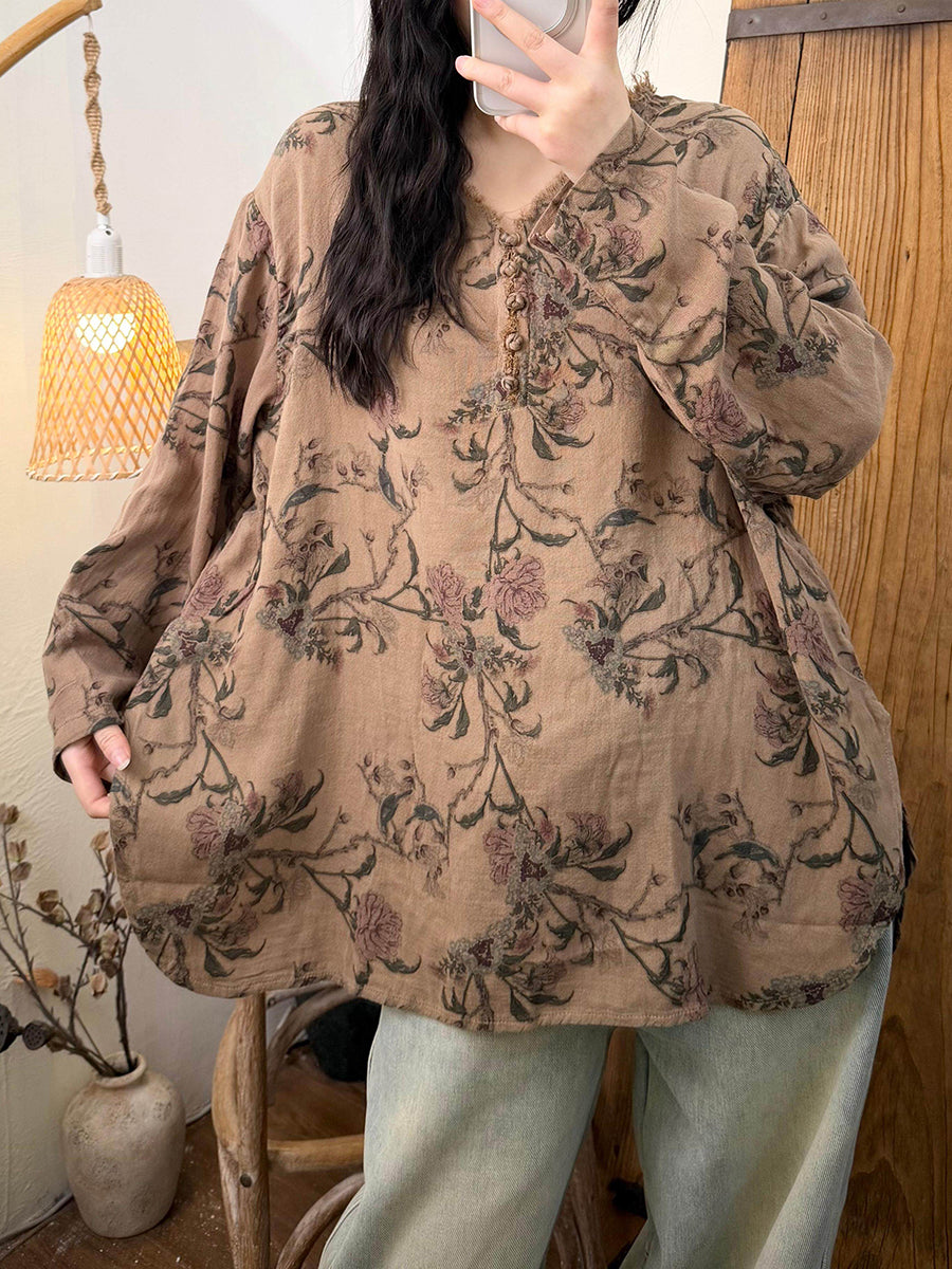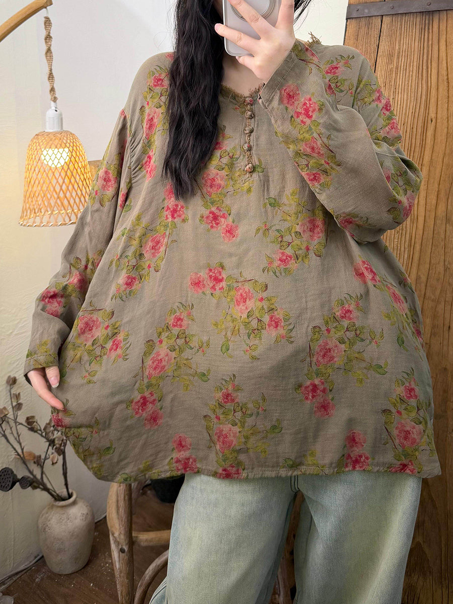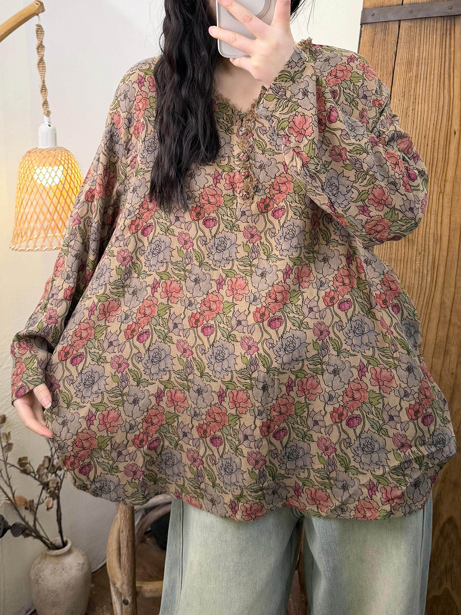 Blusa de algodón con cuello en V y flores retro de primavera para mujer