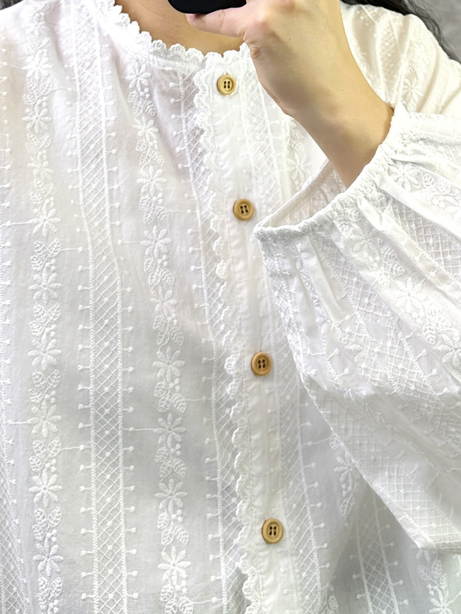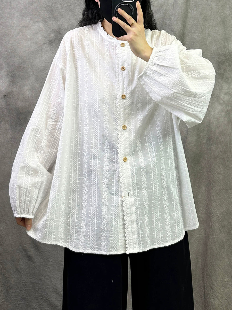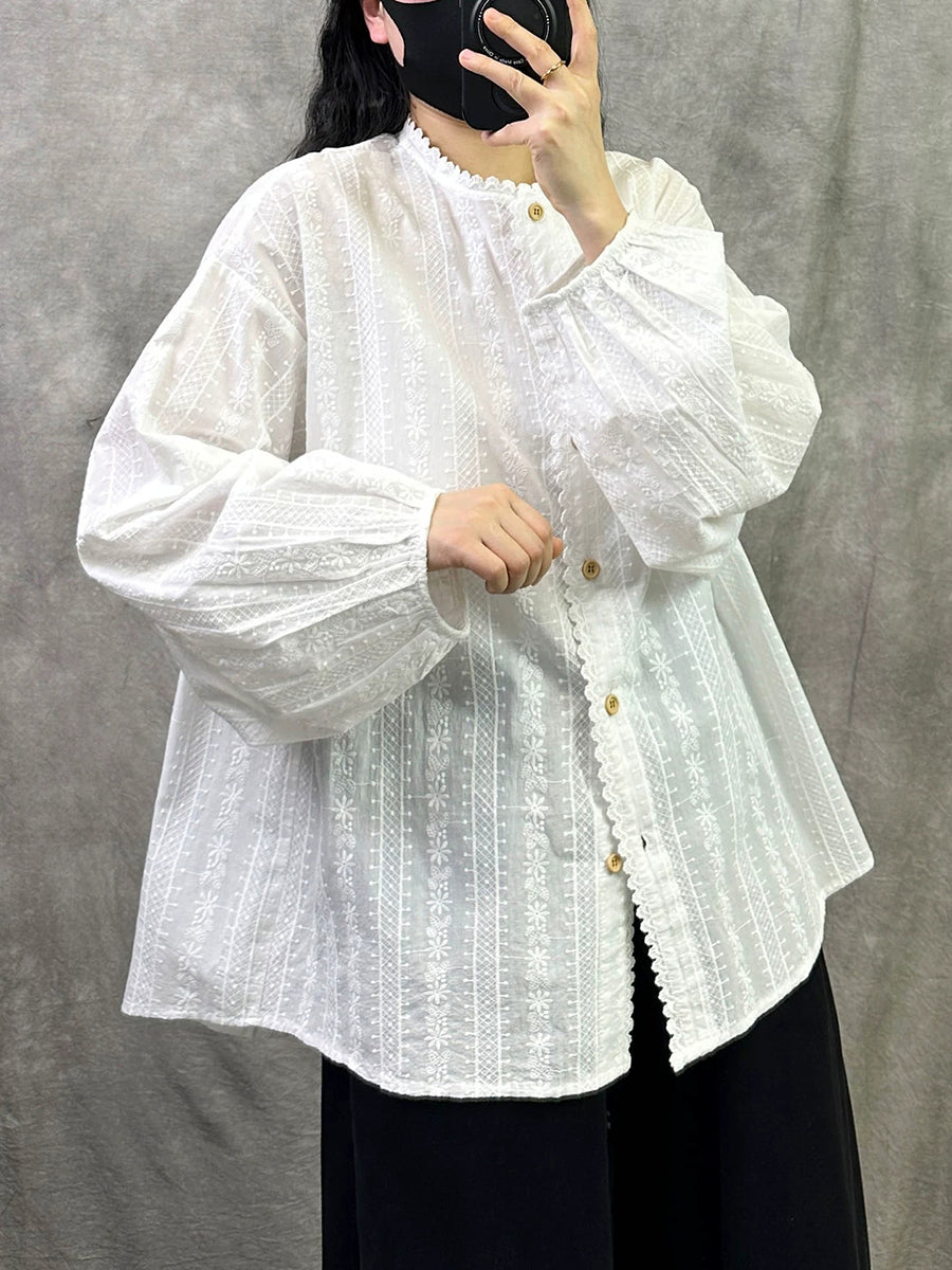 Camisa de cuello alto 100 % algodón con bordado artístico de primavera para mujer