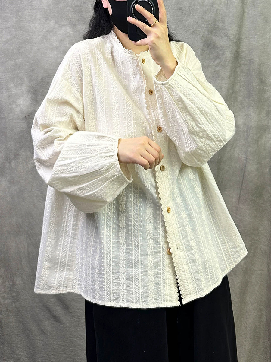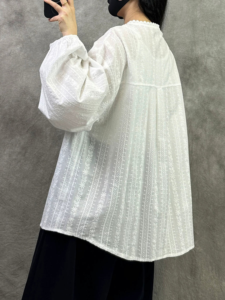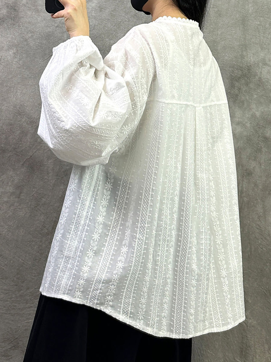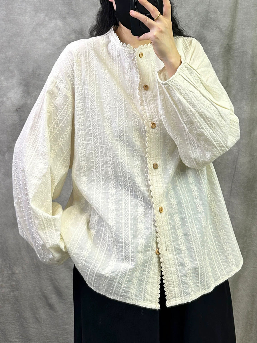 Camisa de cuello alto 100 % algodón con bordado artístico de primavera para mujer