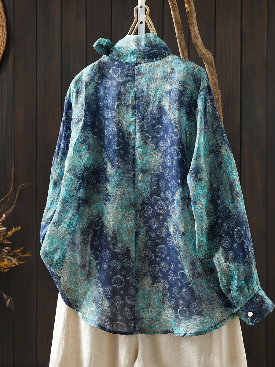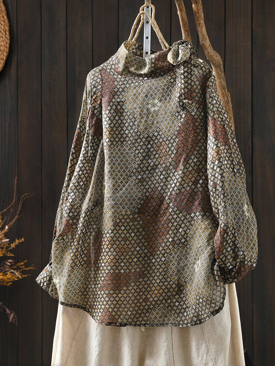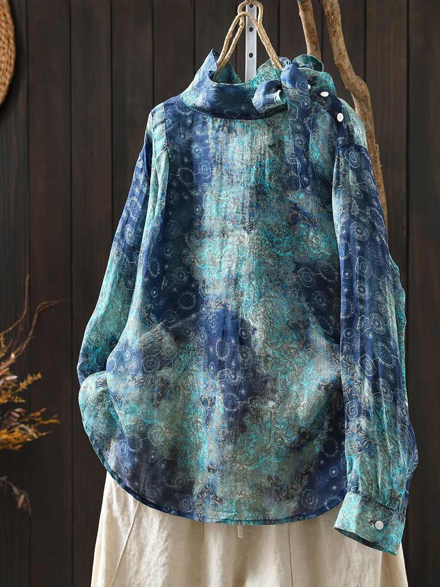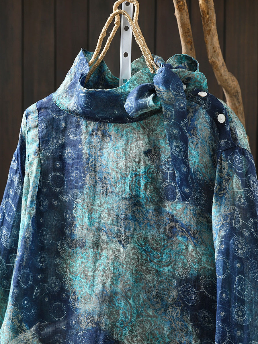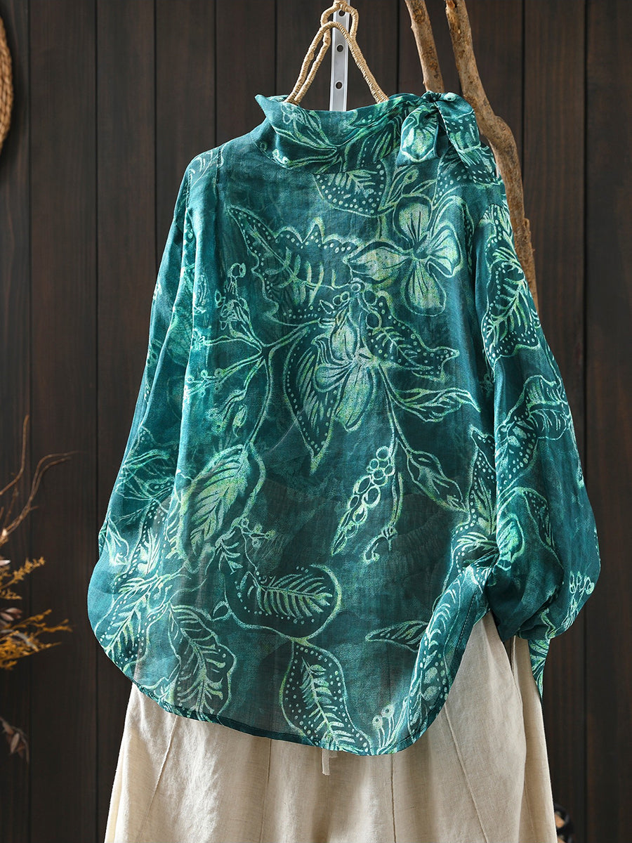 Blusa de cuello alto 100 % ramio con flores artísticas de primavera para mujer