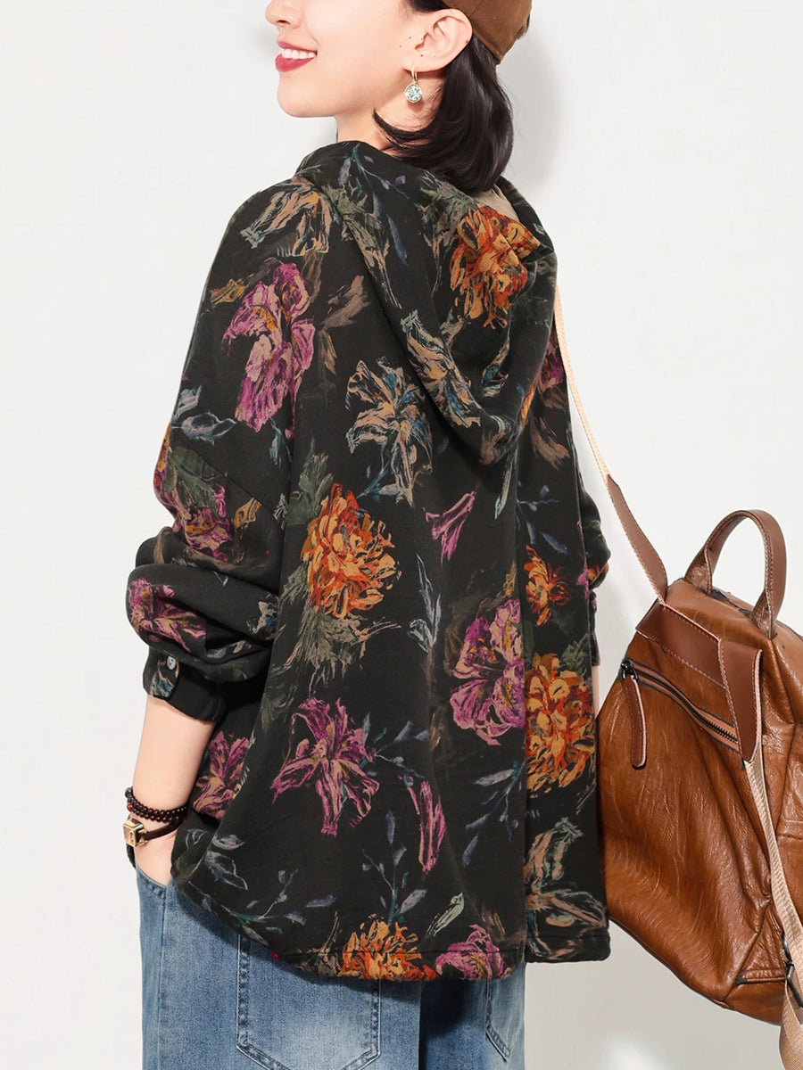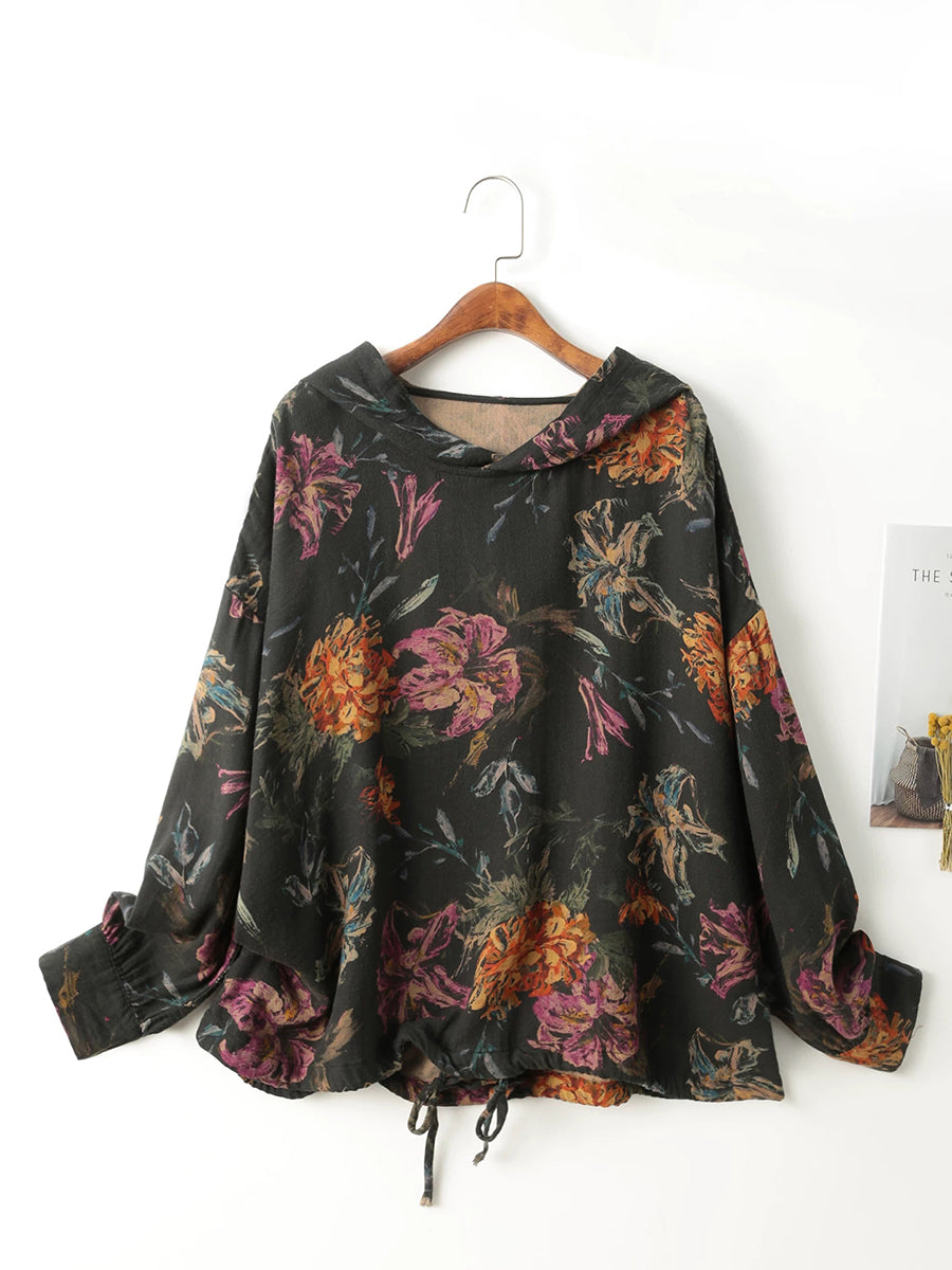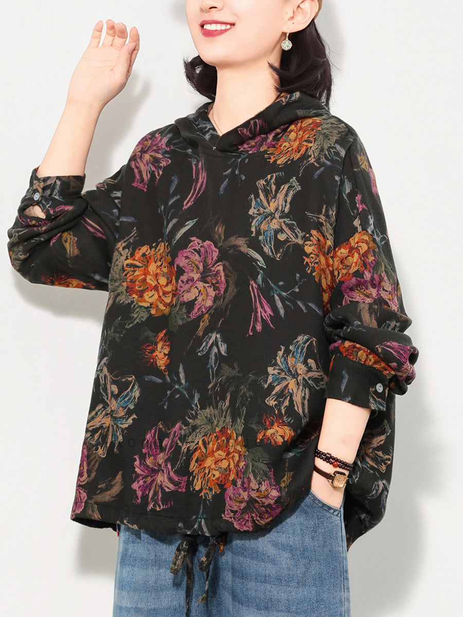 Sudadera con capucha de algodón con estampado floral artístico de primavera para mujer