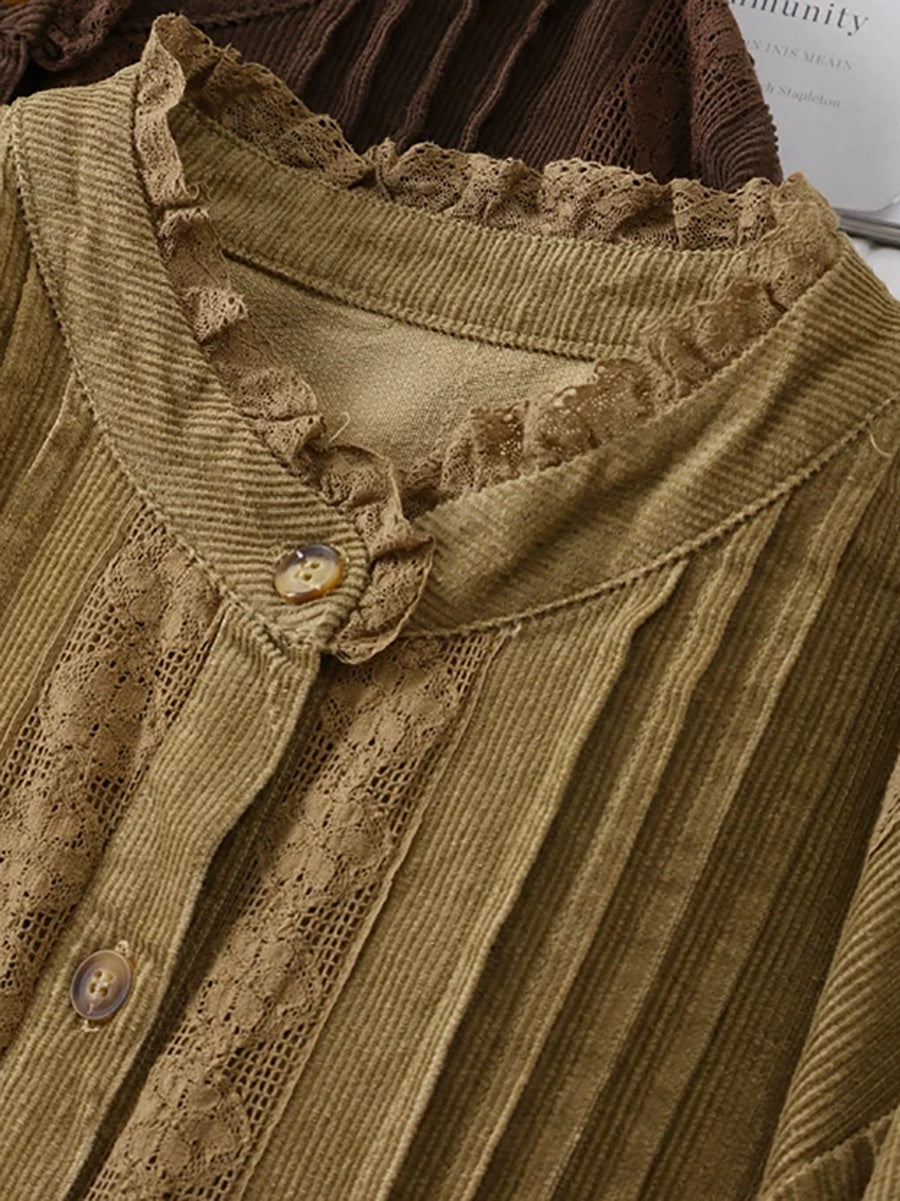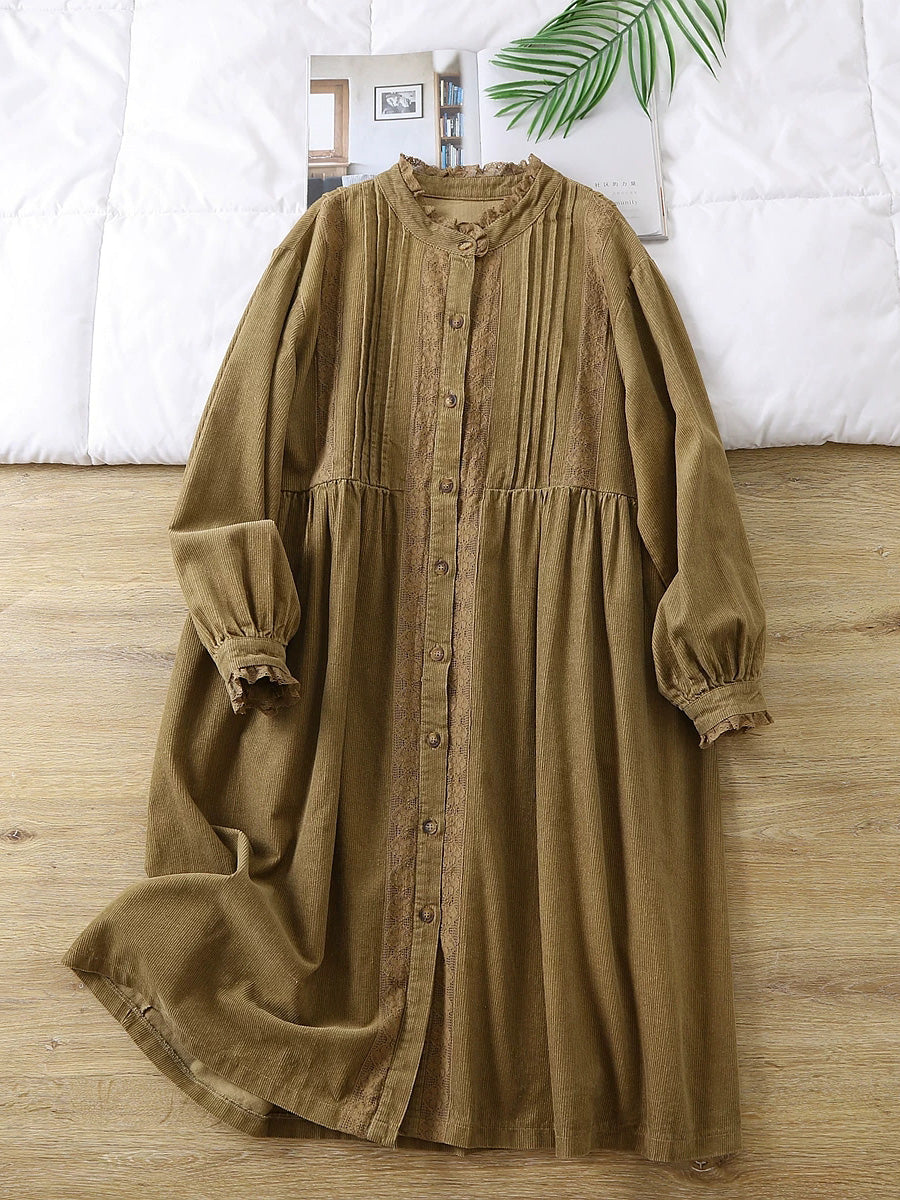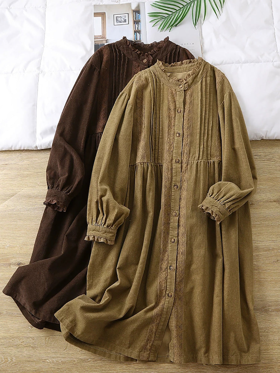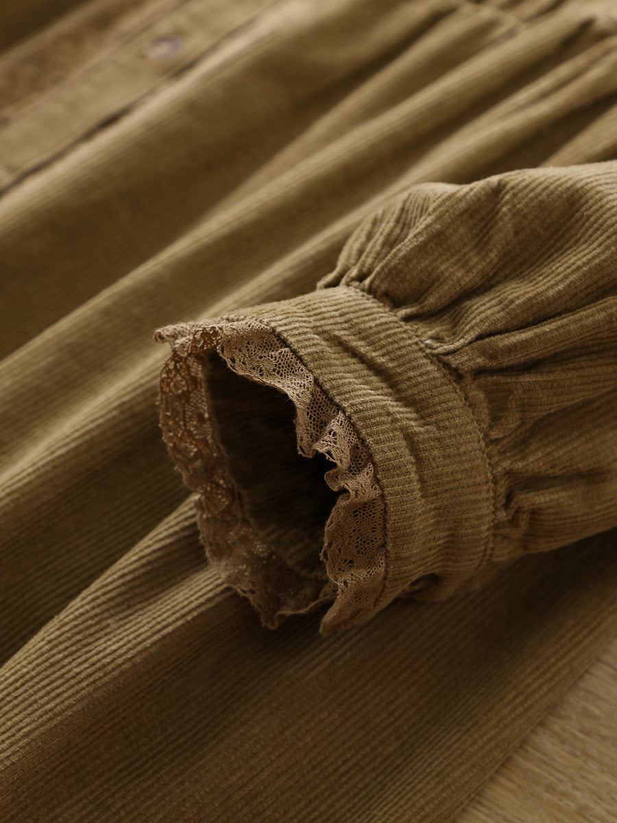 Vestido de pana fruncido con encaje artístico de primavera para mujer