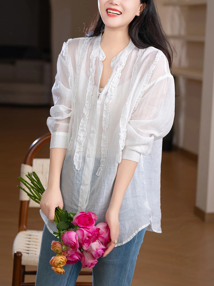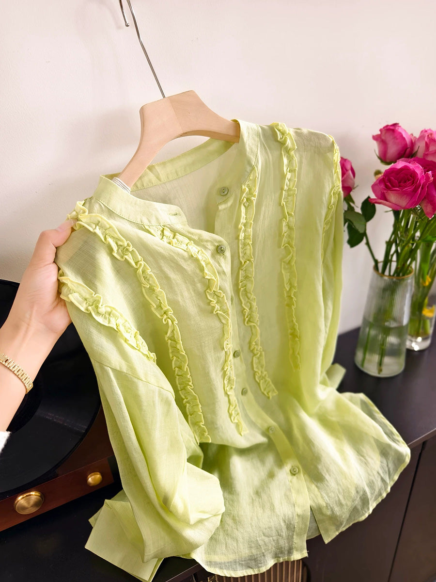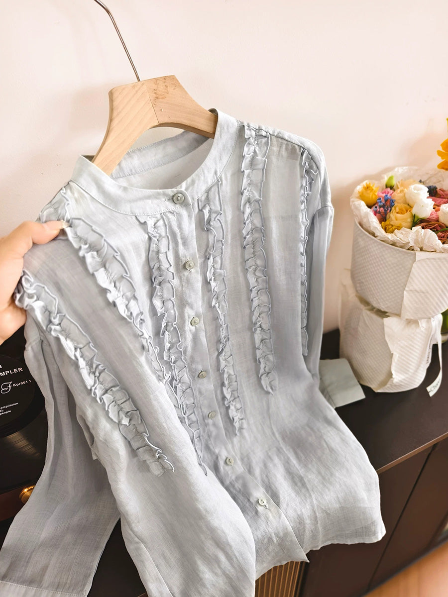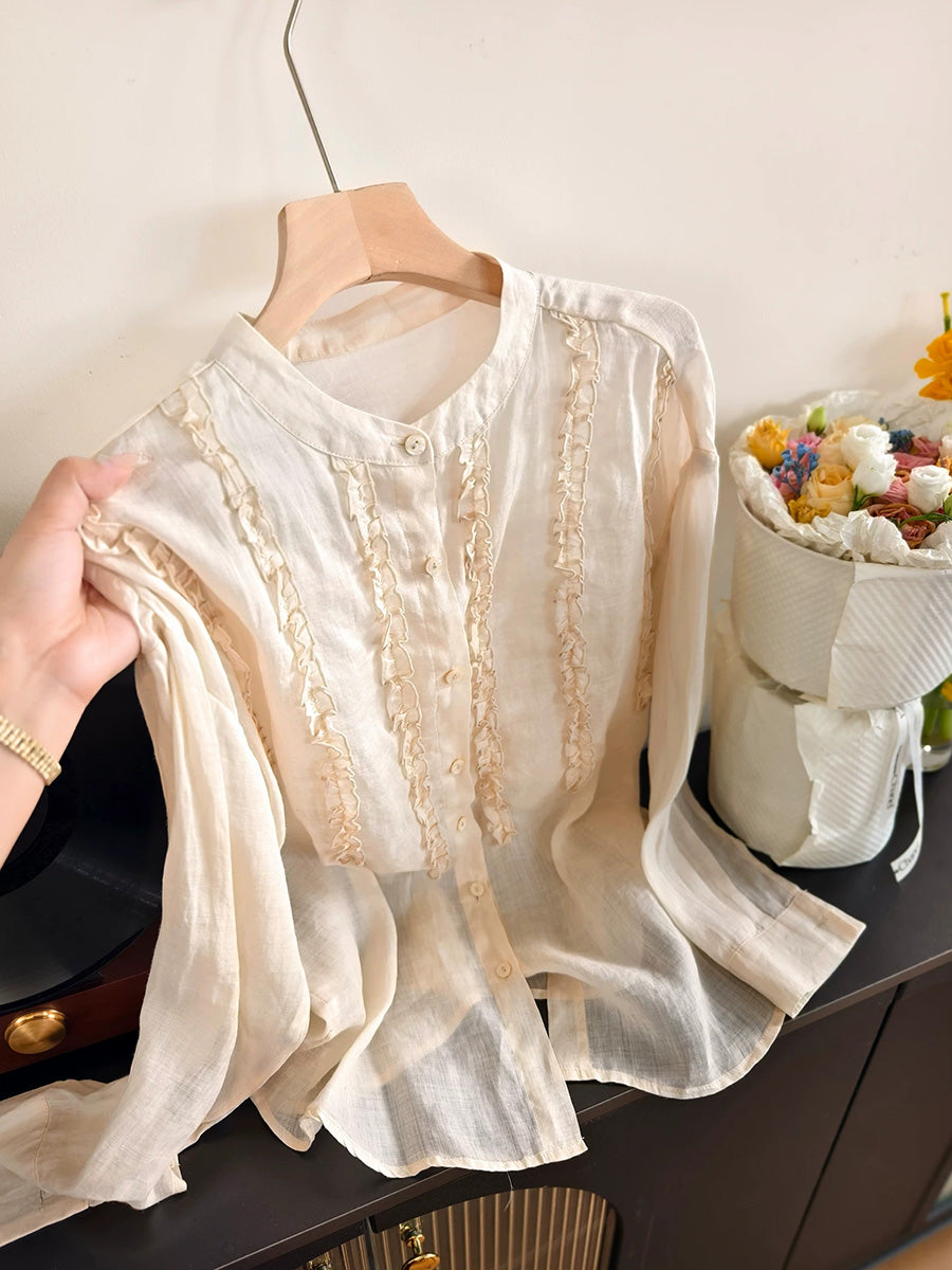 Camisa de mujer de primavera con cuello alto y estilo artístico, 100% ramio.