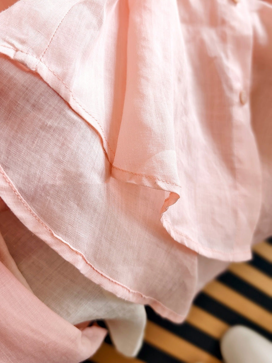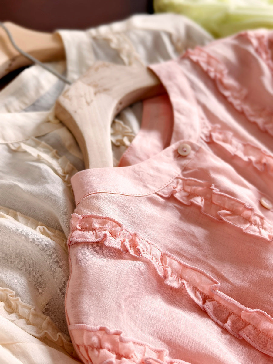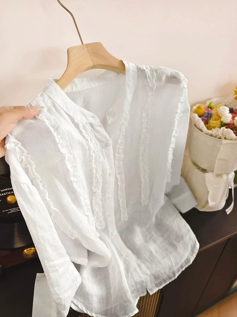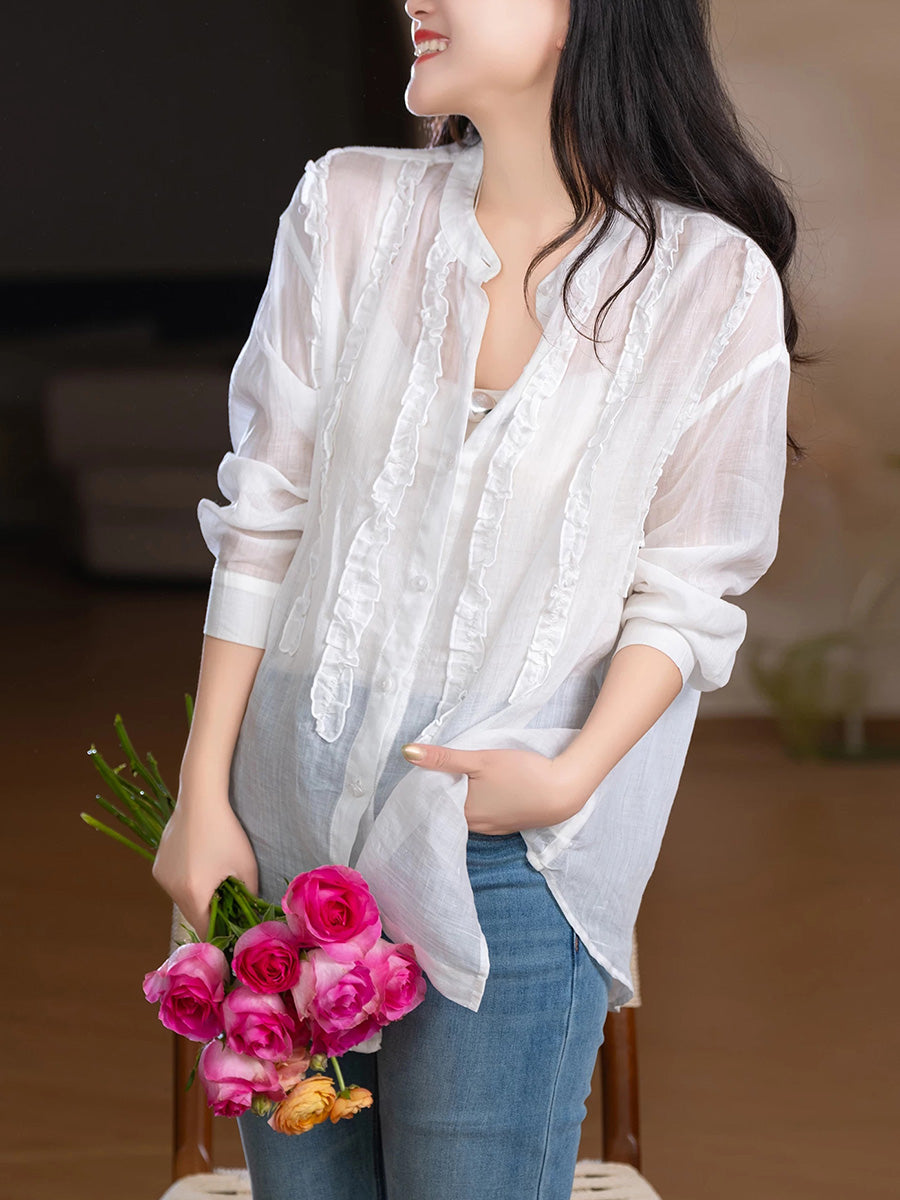Camisa de mujer de primavera con cuello alto y estilo artístico, 100% ramio.