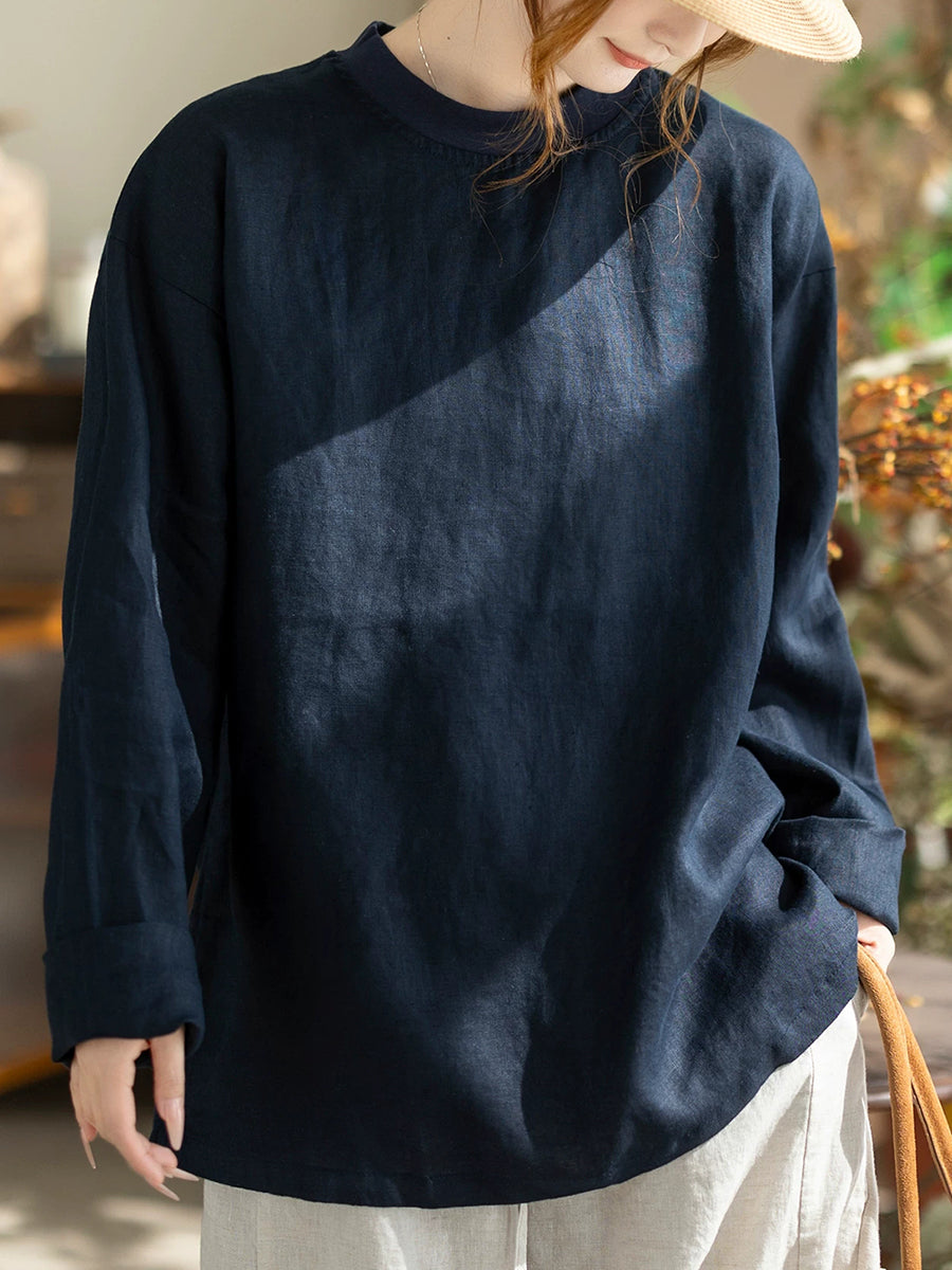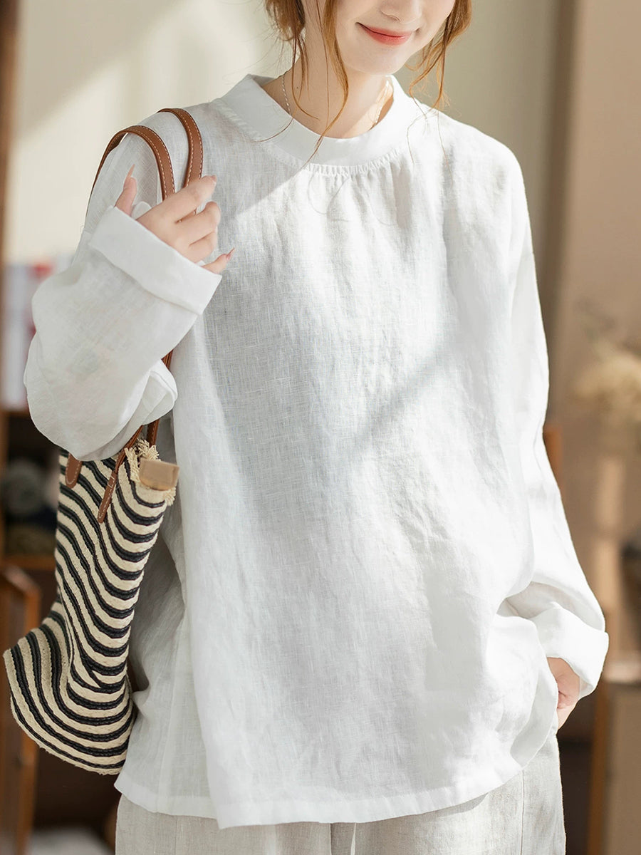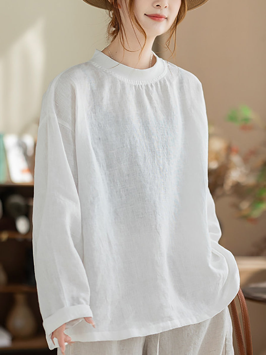 Camisa de cáñamo de color liso con cuello alto, estilo casual de primavera para mujer.