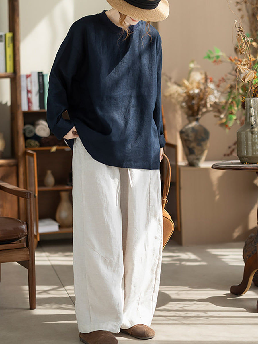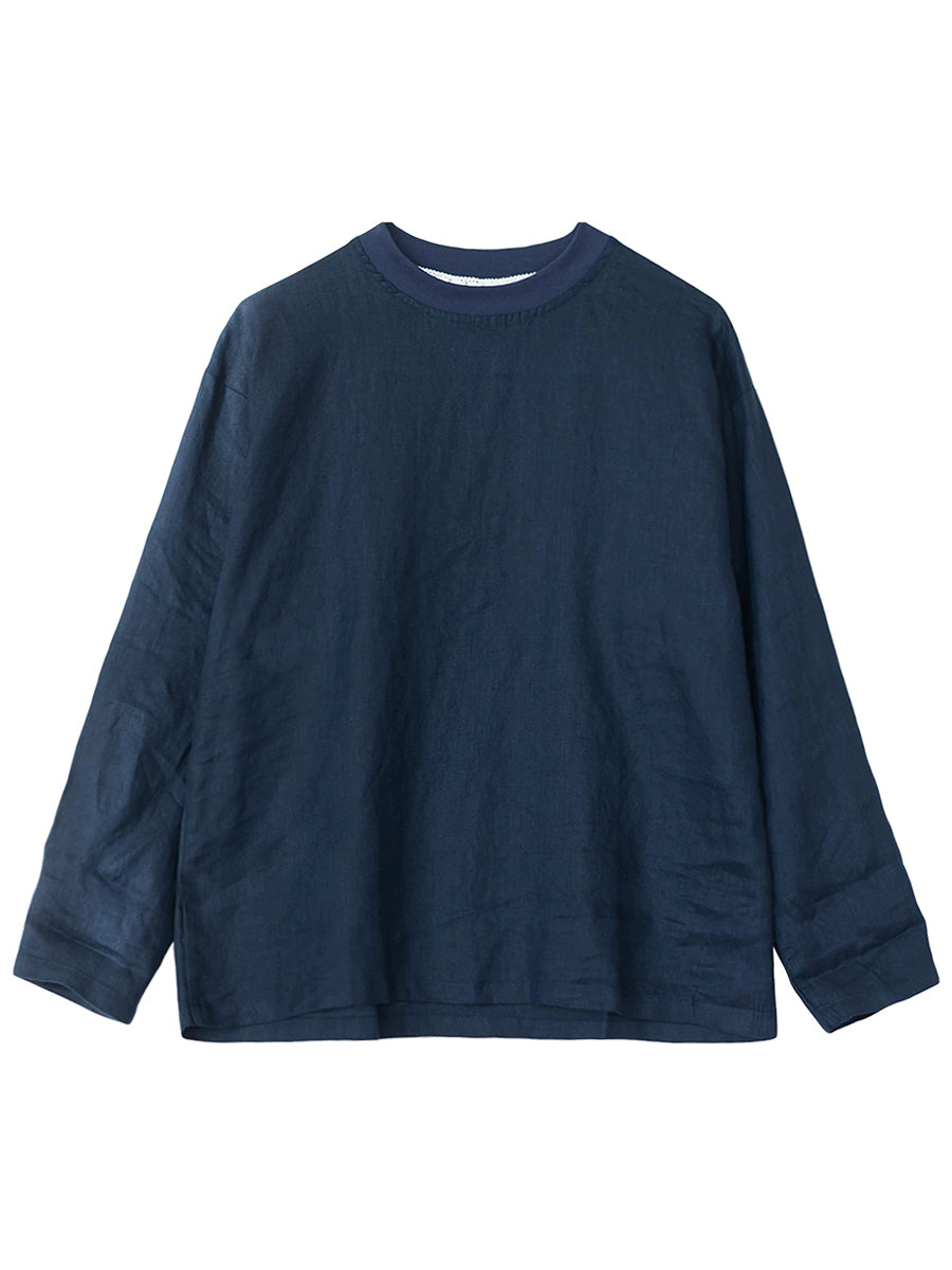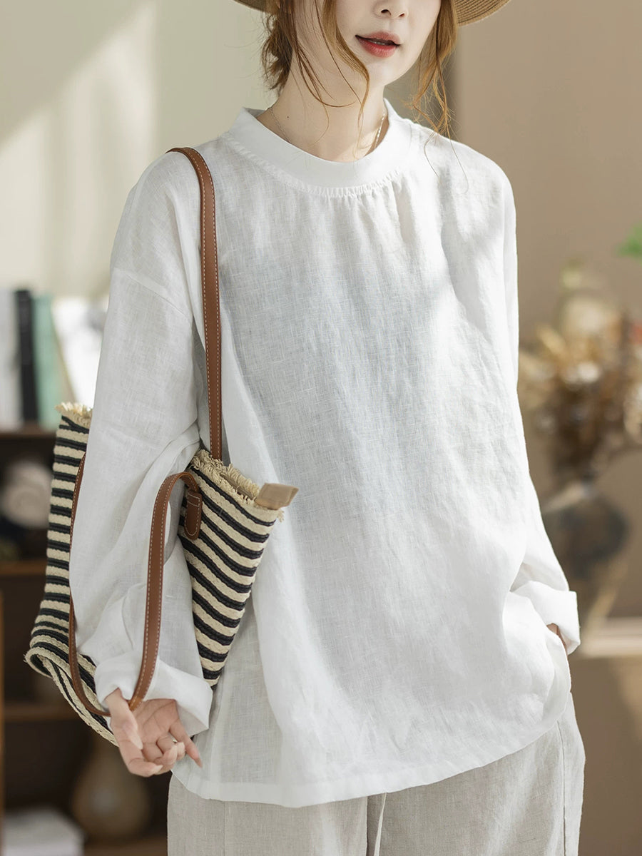 Camisa de cáñamo de color liso con cuello alto, estilo casual de primavera para mujer.