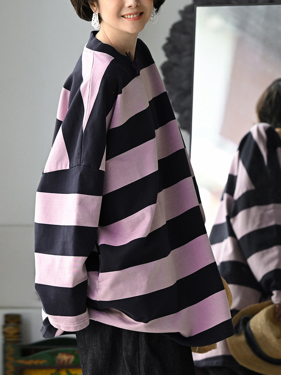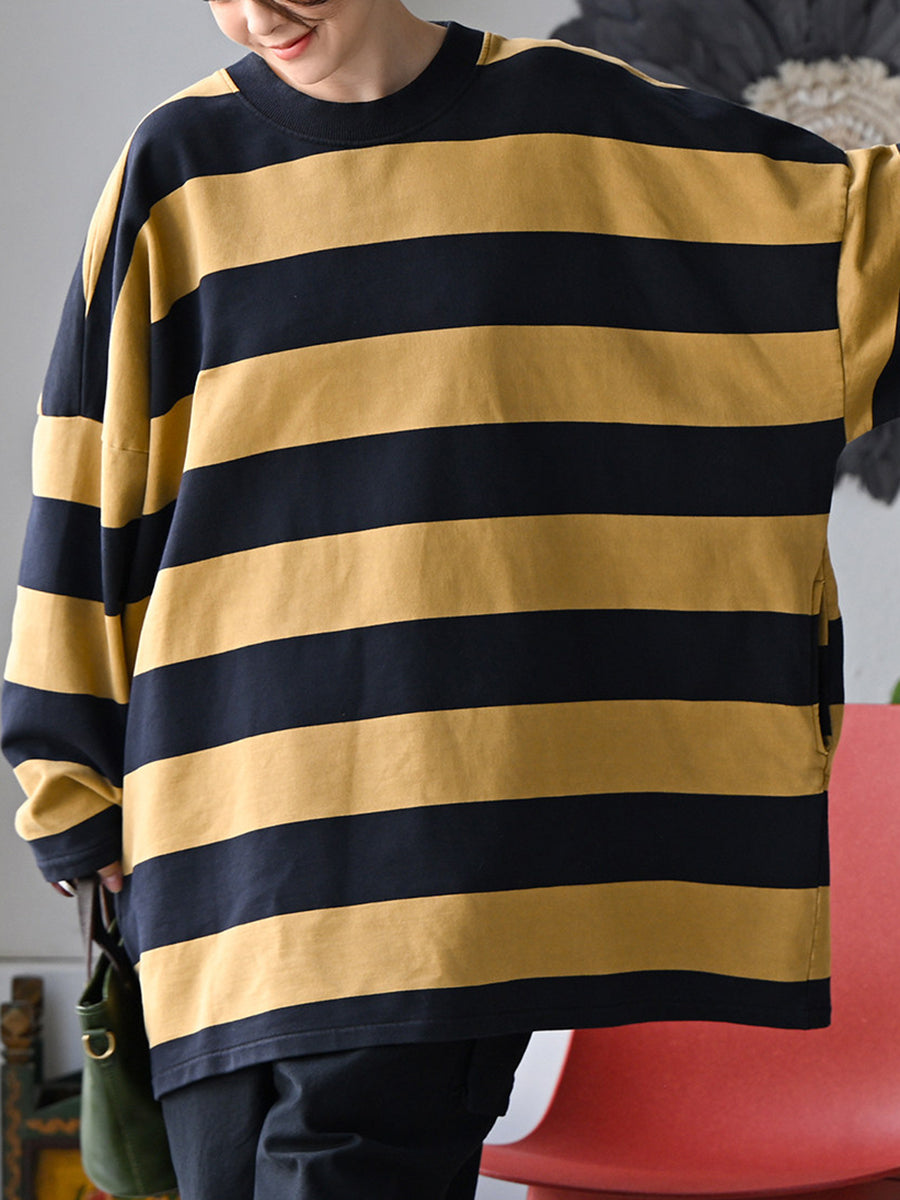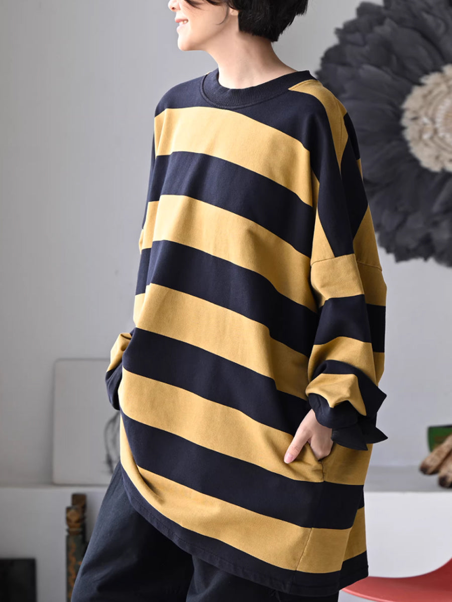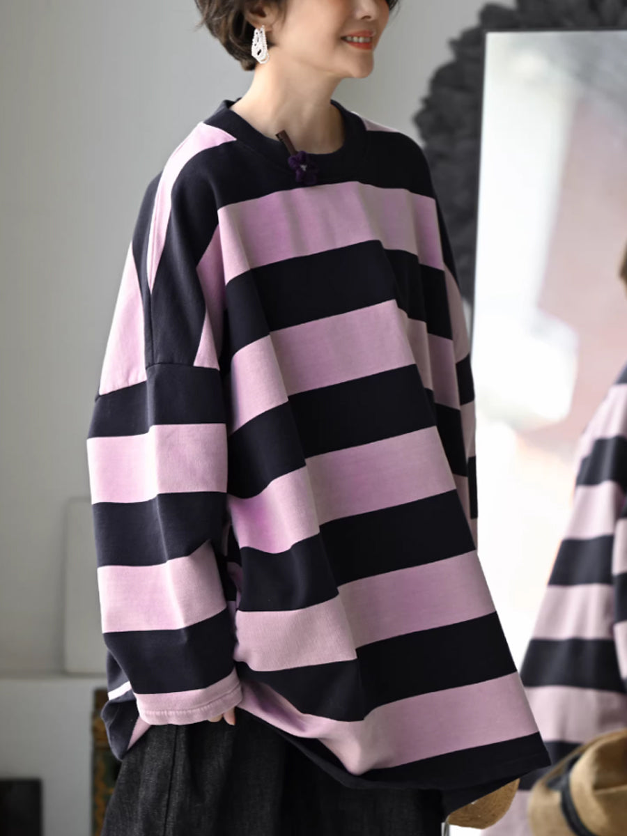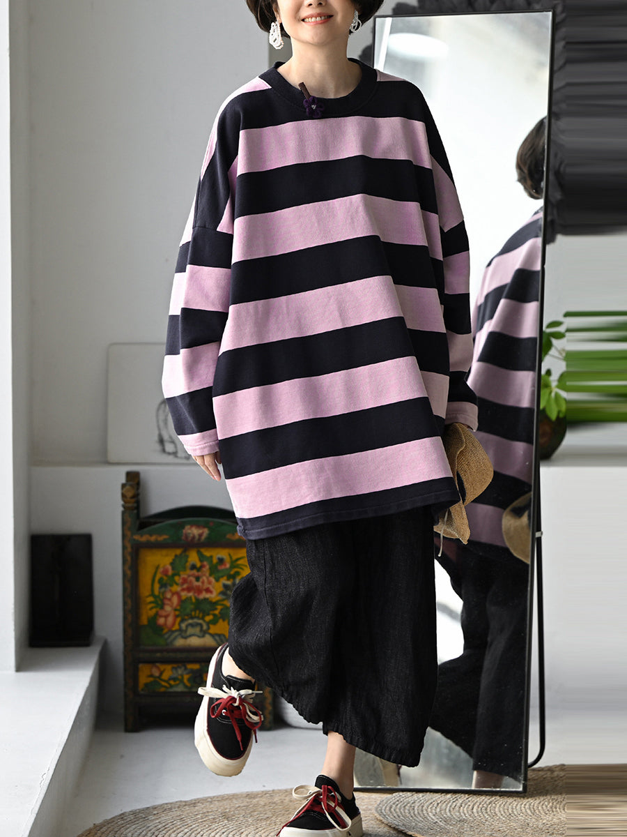 Camisa casual de manga larga para mujer, de manga larga, a rayas, cuello redondo, 100% algodón.