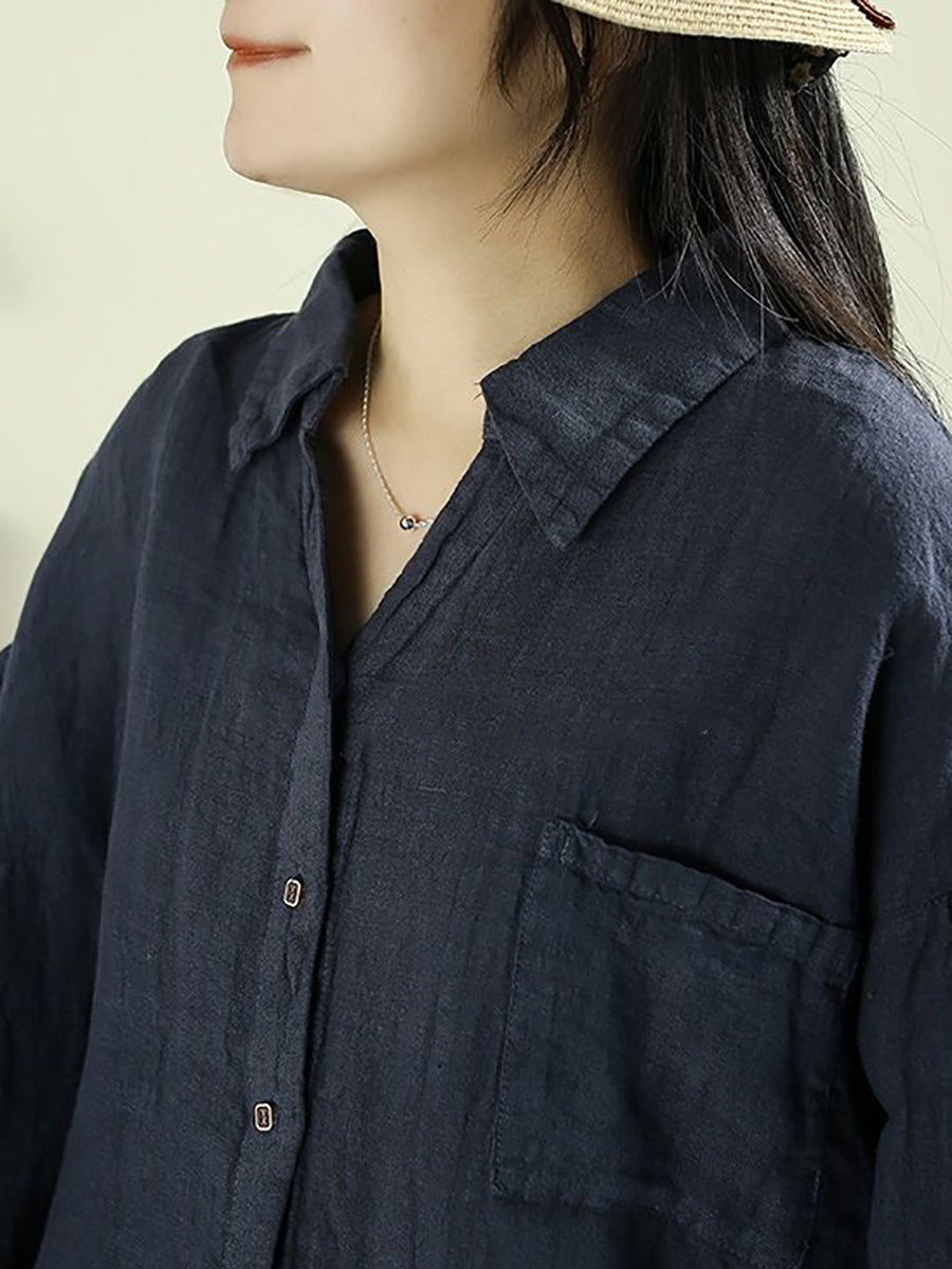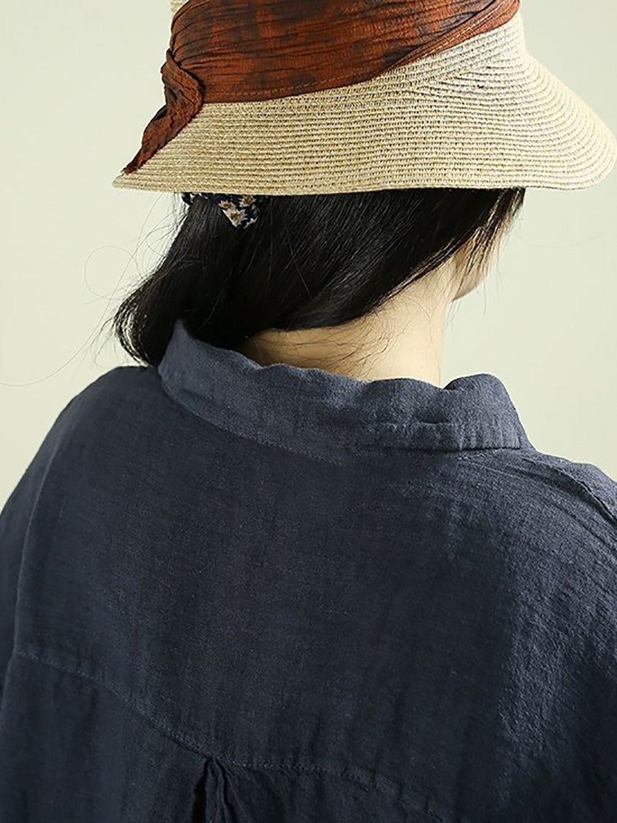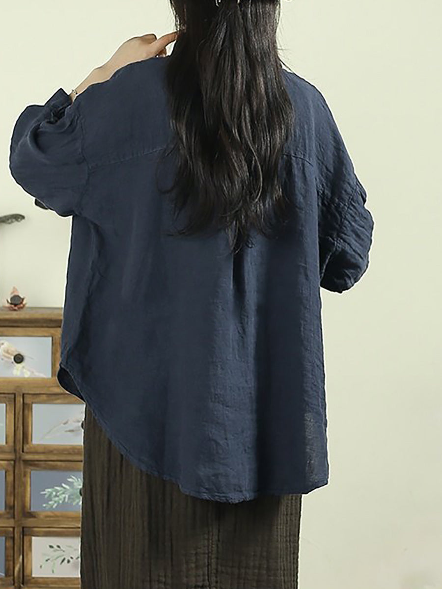Camisa de lino 100 % con cuello vuelto y color puro para mujer, primavera