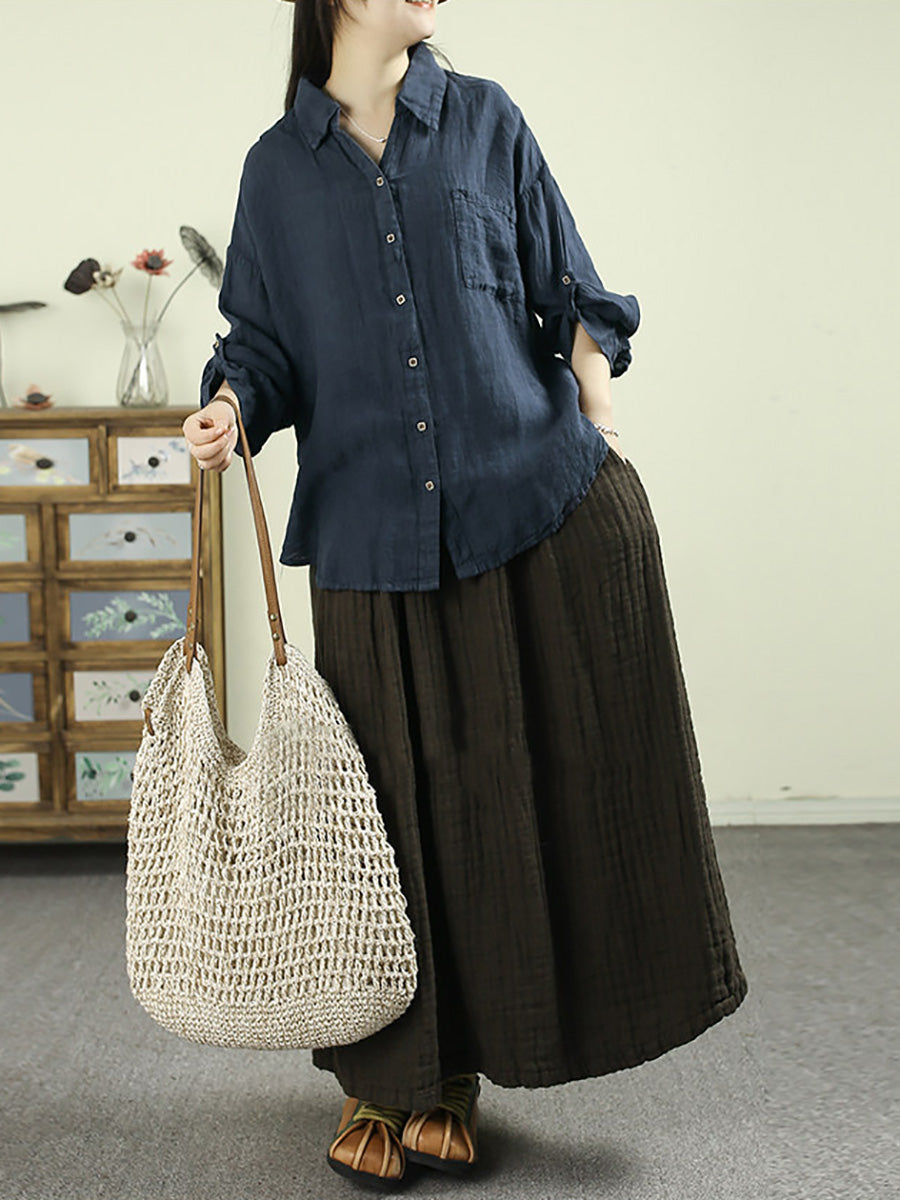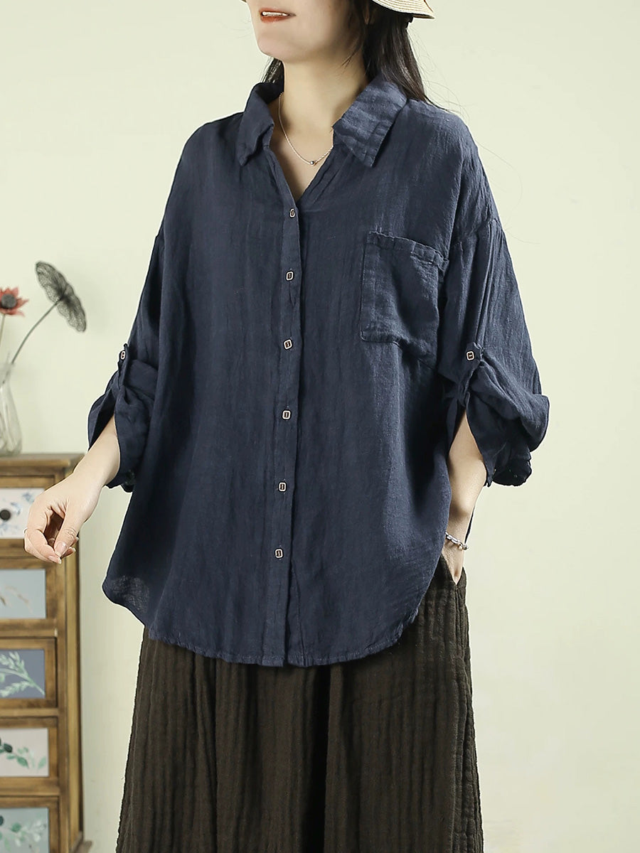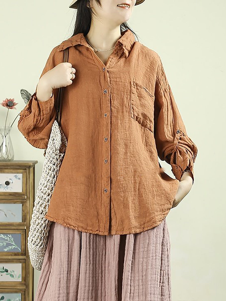 Camisa de lino 100 % con cuello vuelto y color puro para mujer, primavera