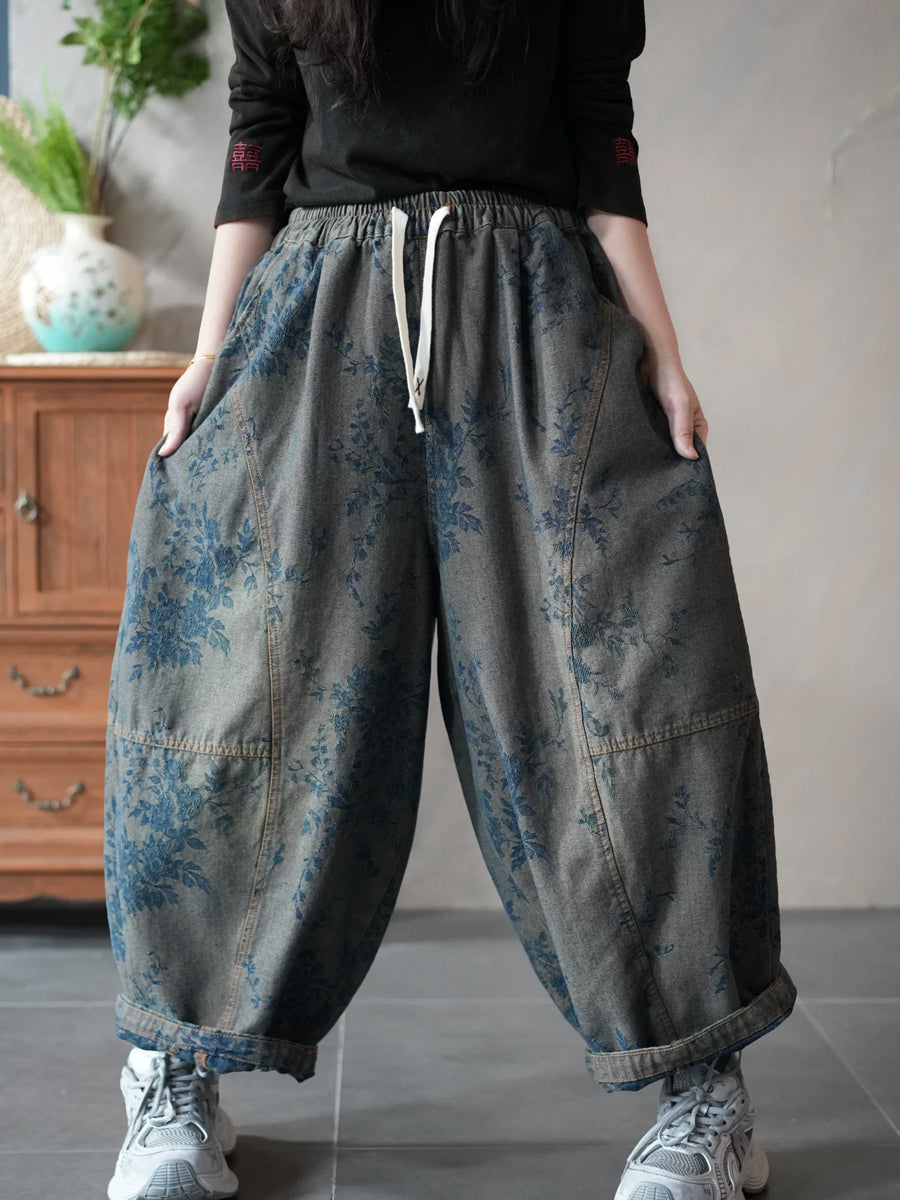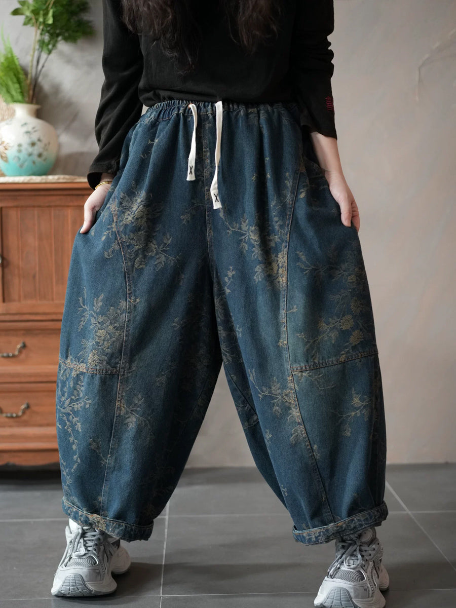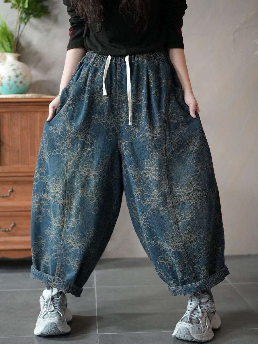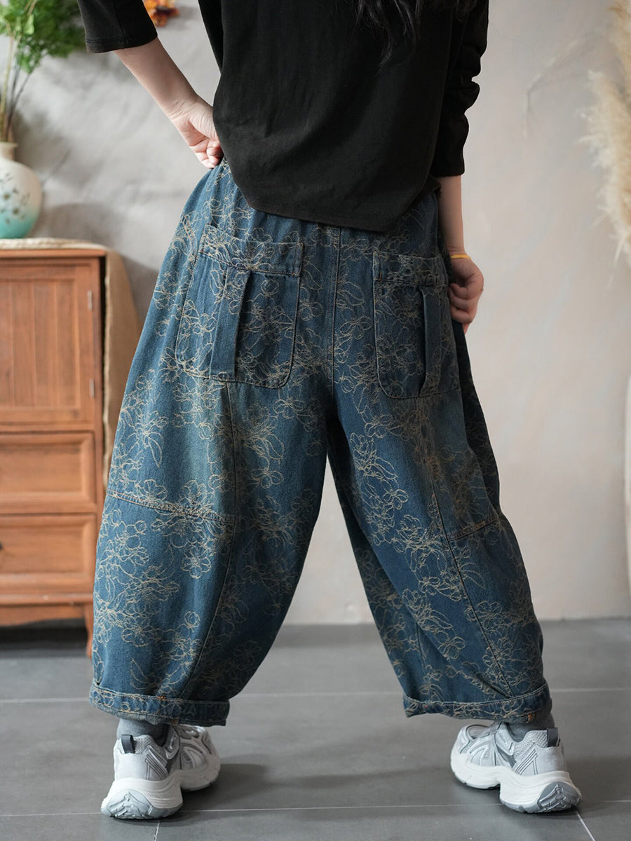 Pantalones harén de mezclilla retro con flores para mujer de primavera