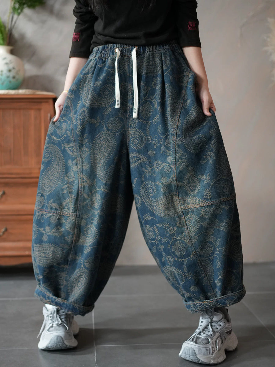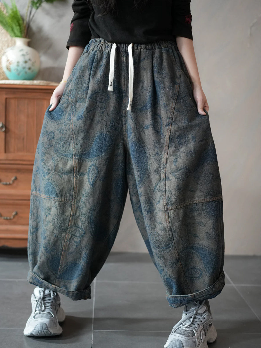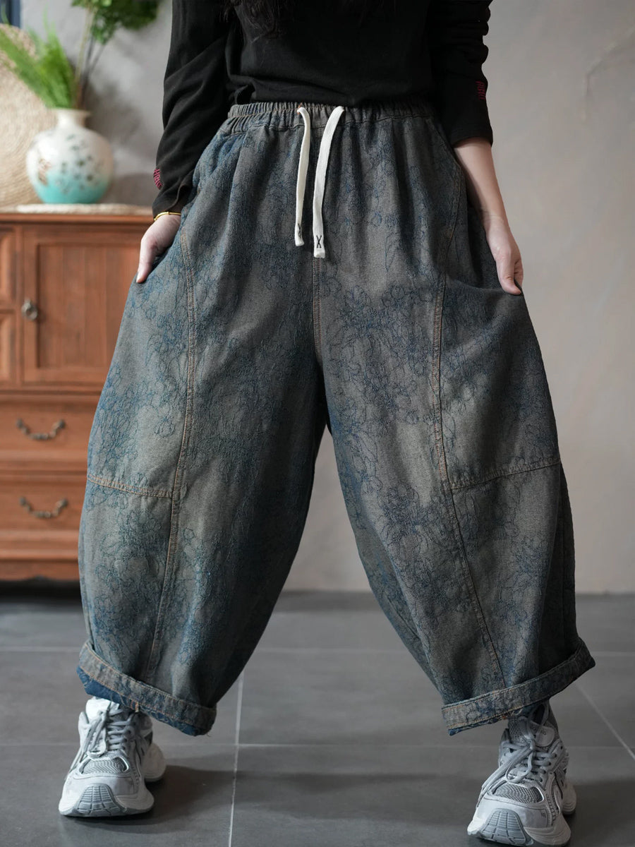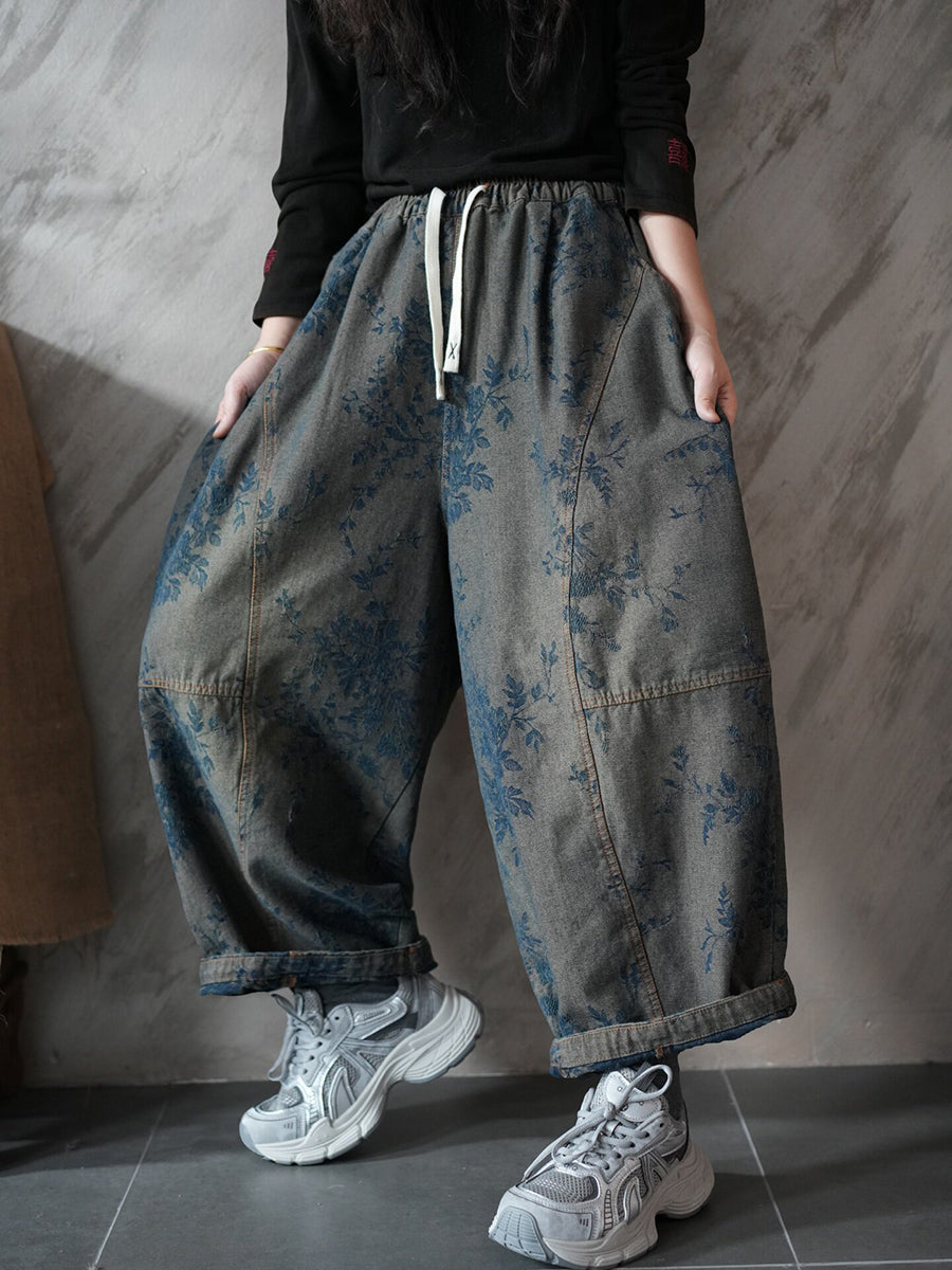 Pantalones harén de mezclilla retro con flores para mujer de primavera