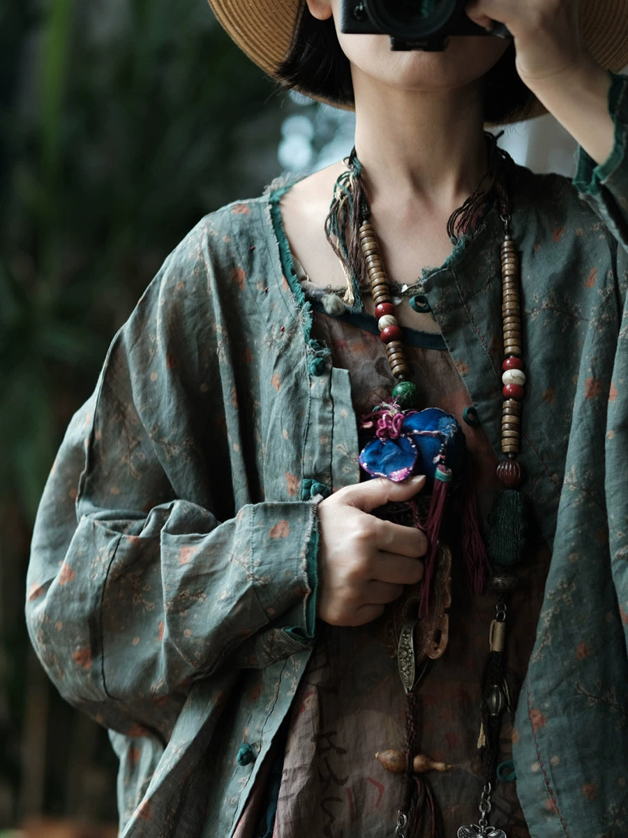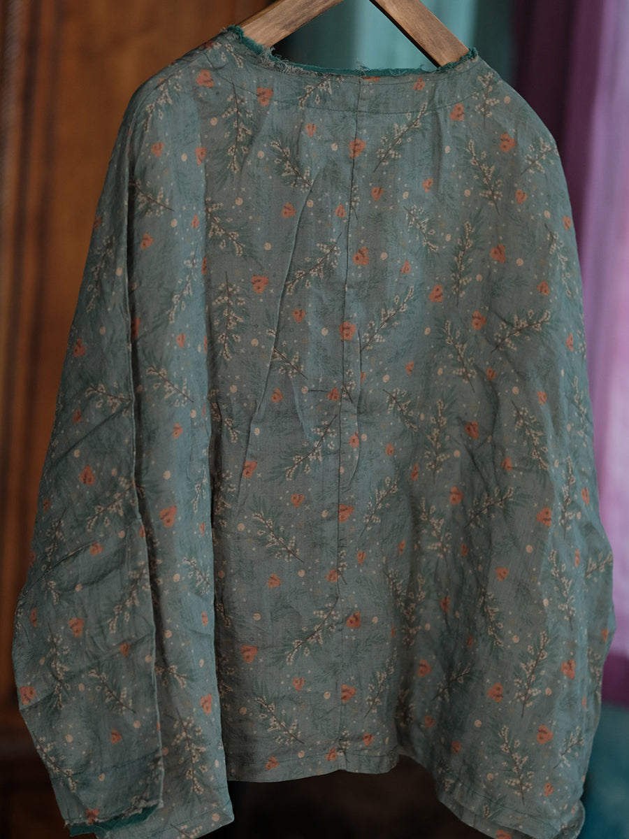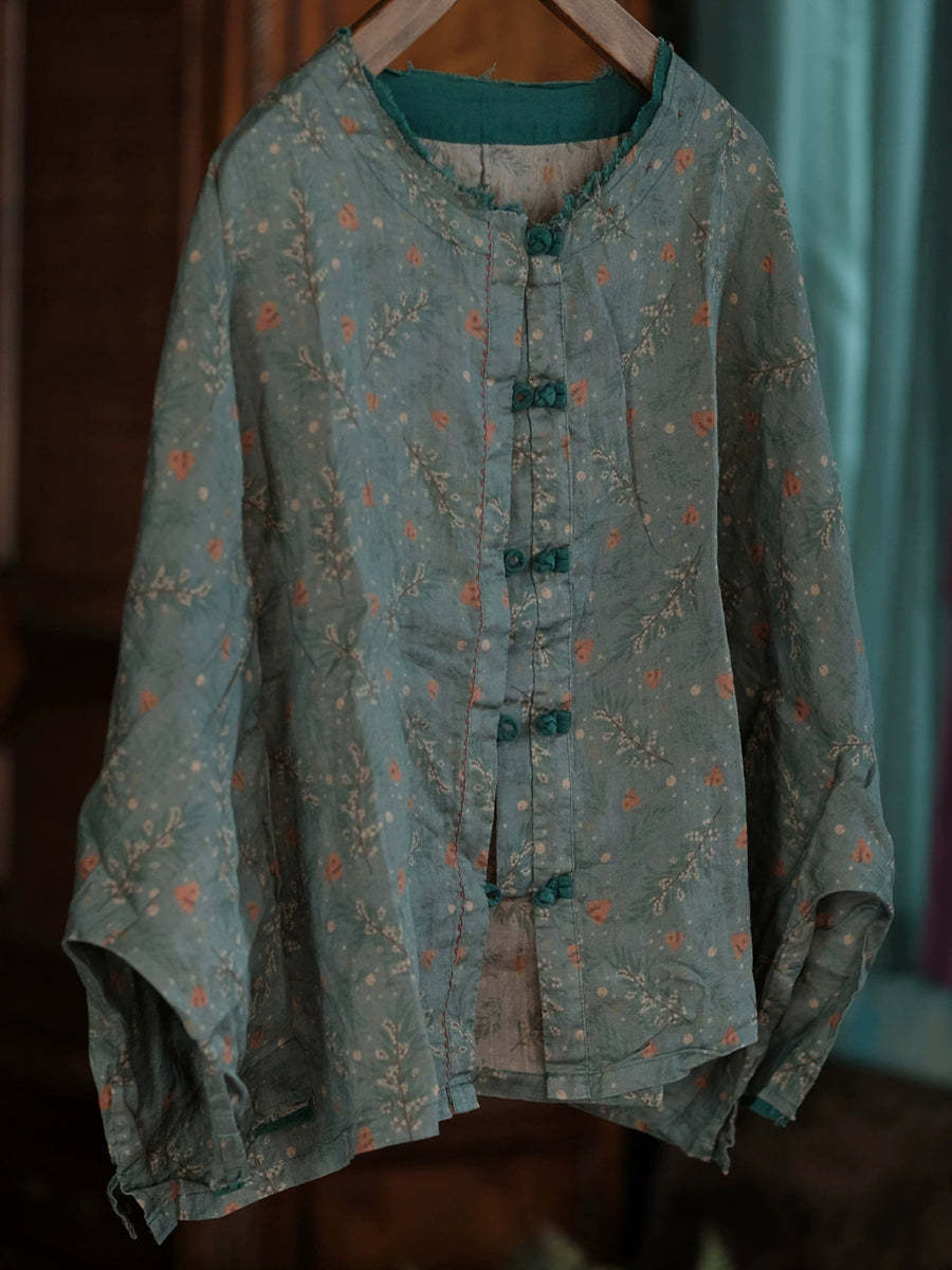 Camisa de lino con cuello redondo y estampado floral retro de primavera para mujer