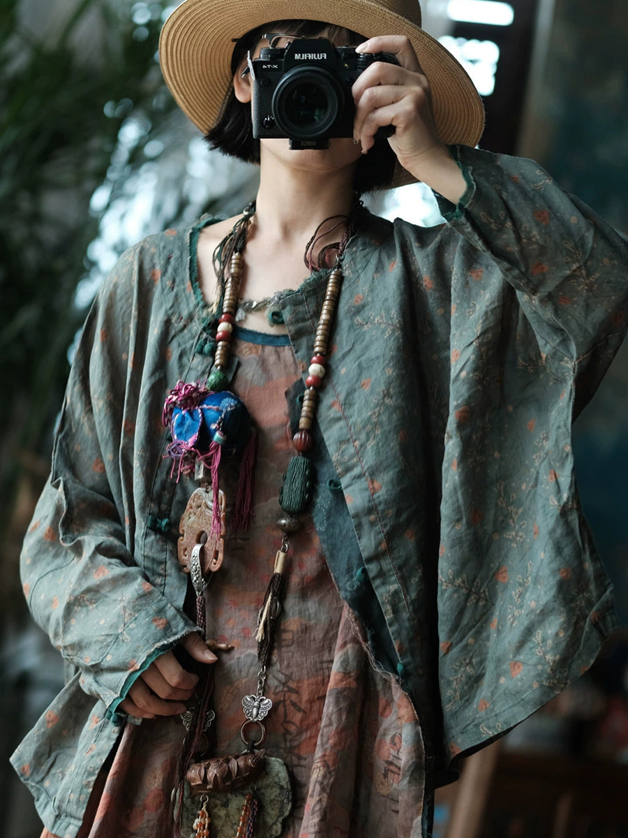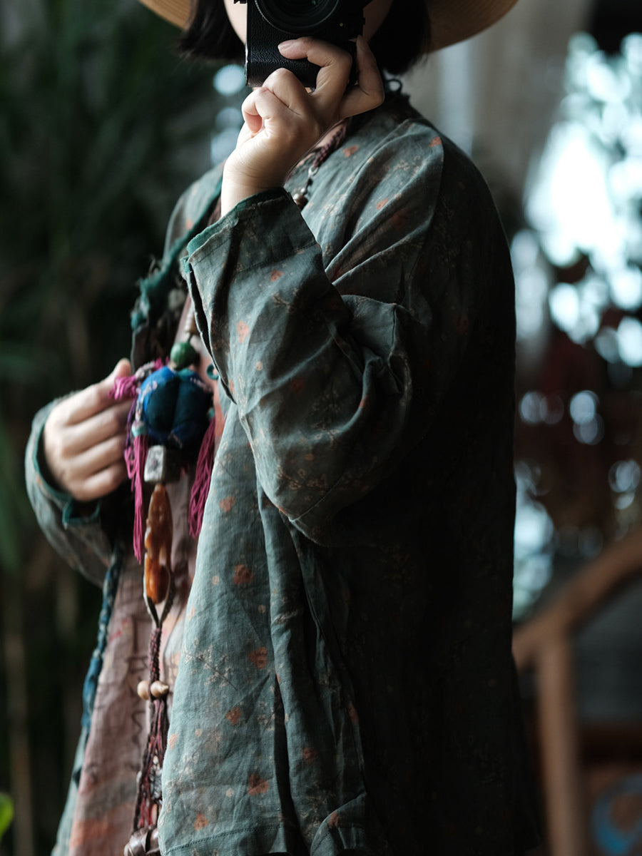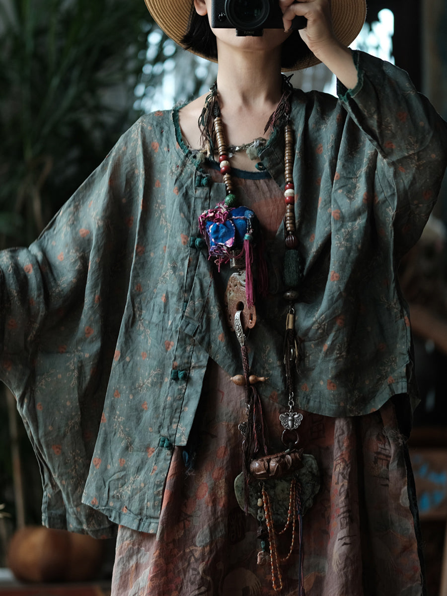 Camisa de lino con cuello redondo y estampado floral retro de primavera para mujer