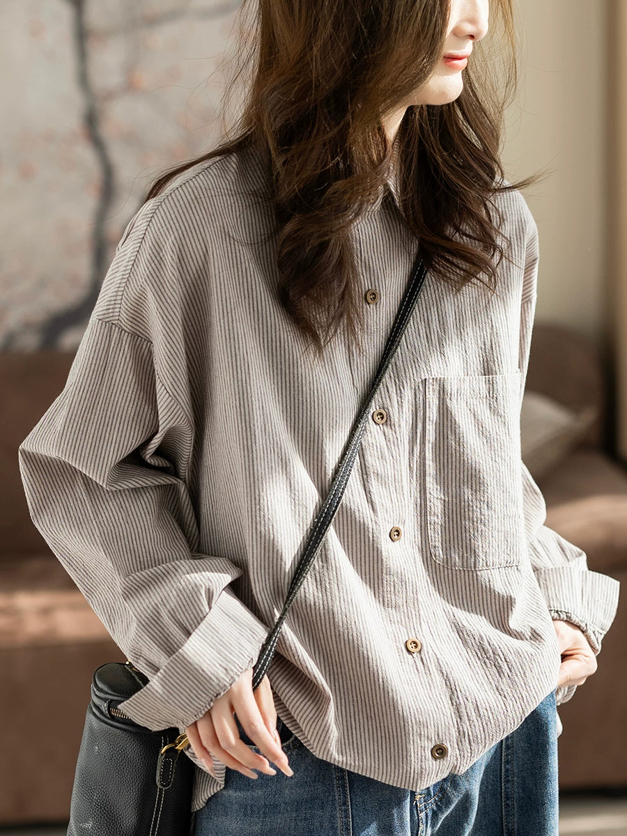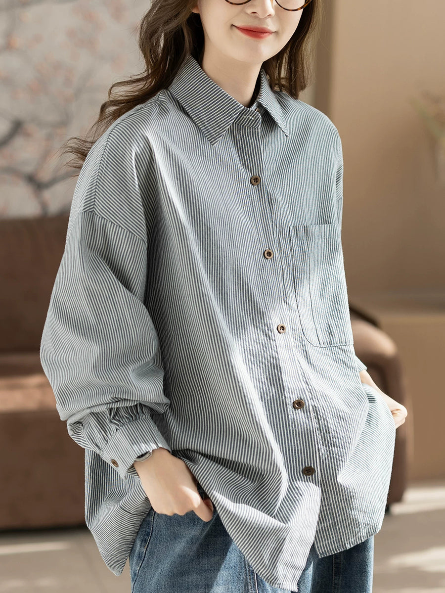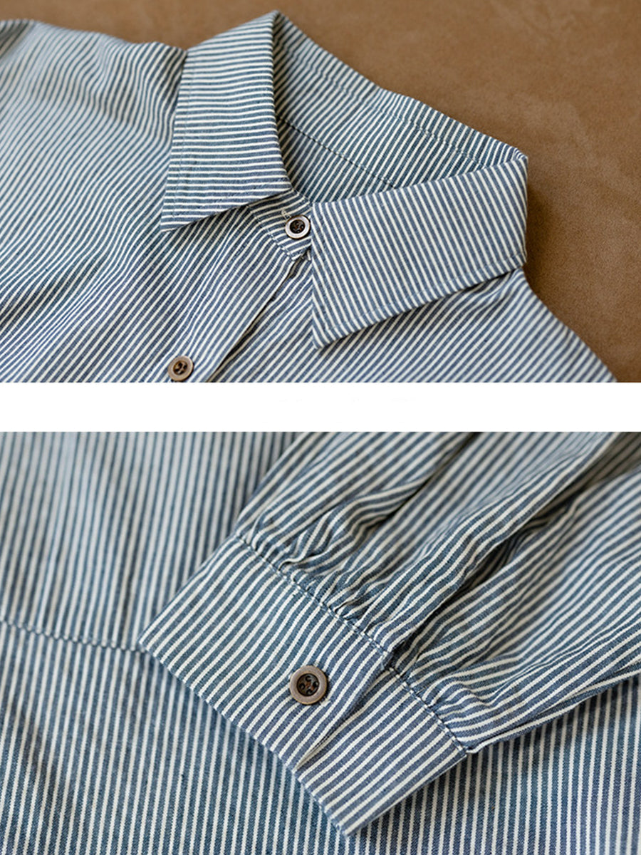 Camisa de algodón con cuello vuelto y rayas de primavera para mujer