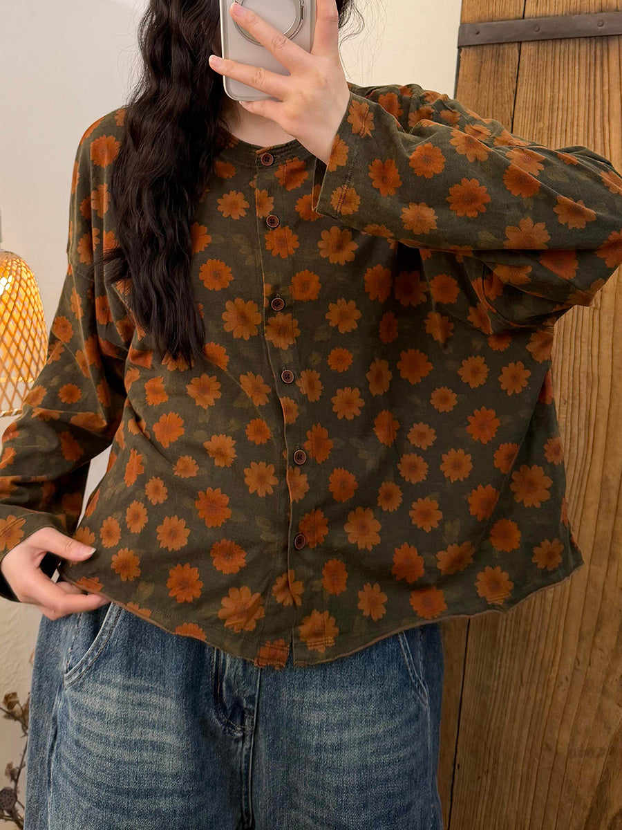 Camisa vintage de primavera con cuello redondo y flores para mujer