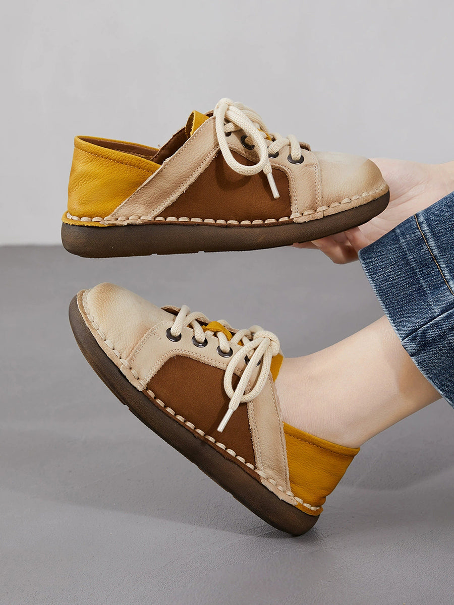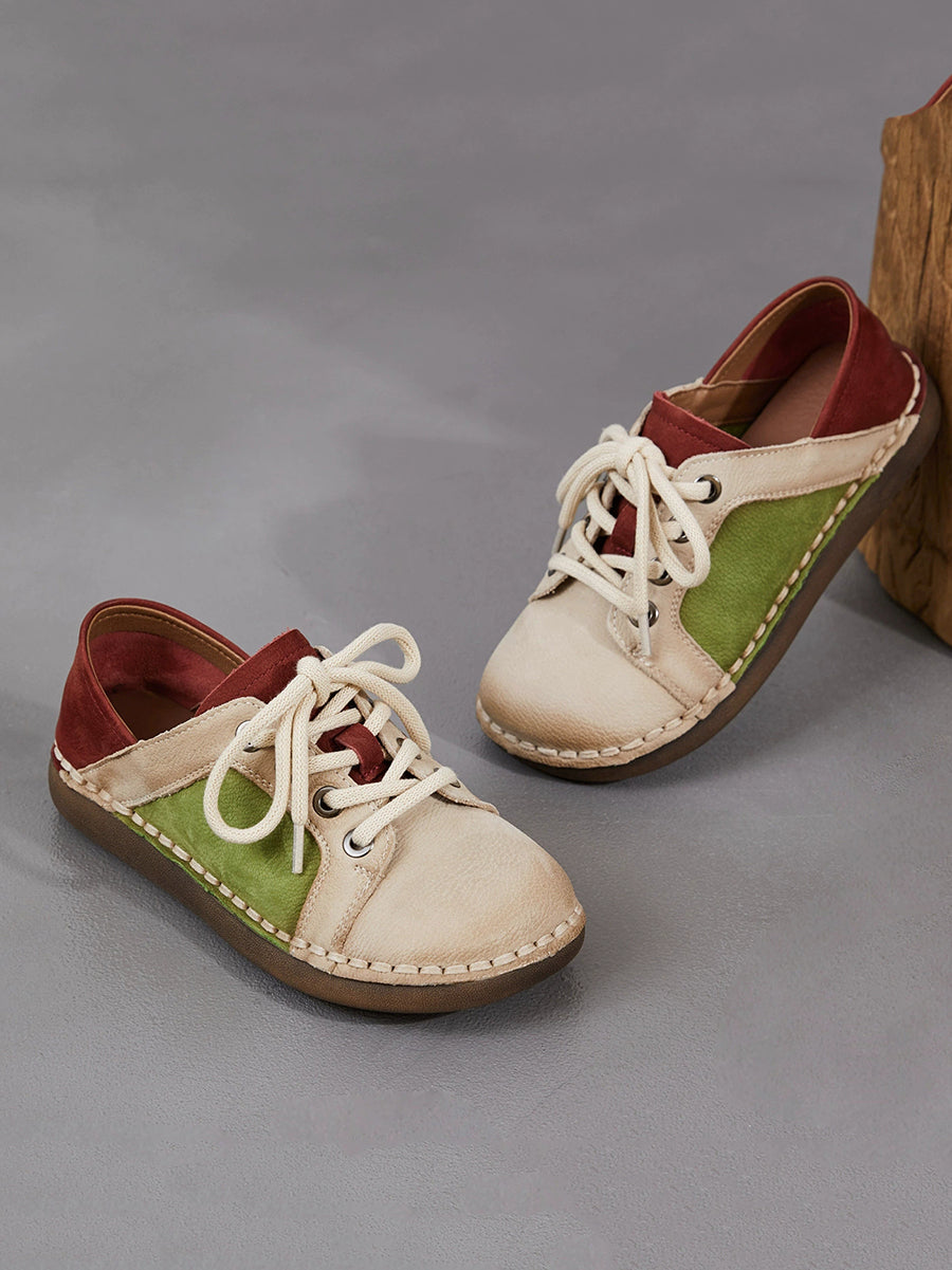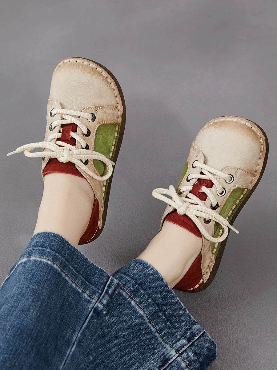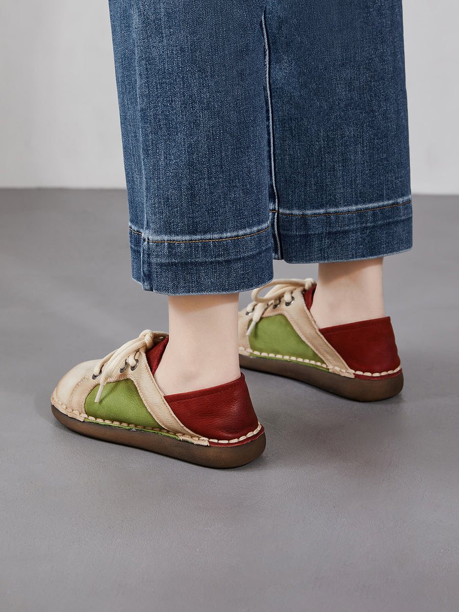 Zapatos planos vintage de piel auténtica con empalmes para mujer, primavera