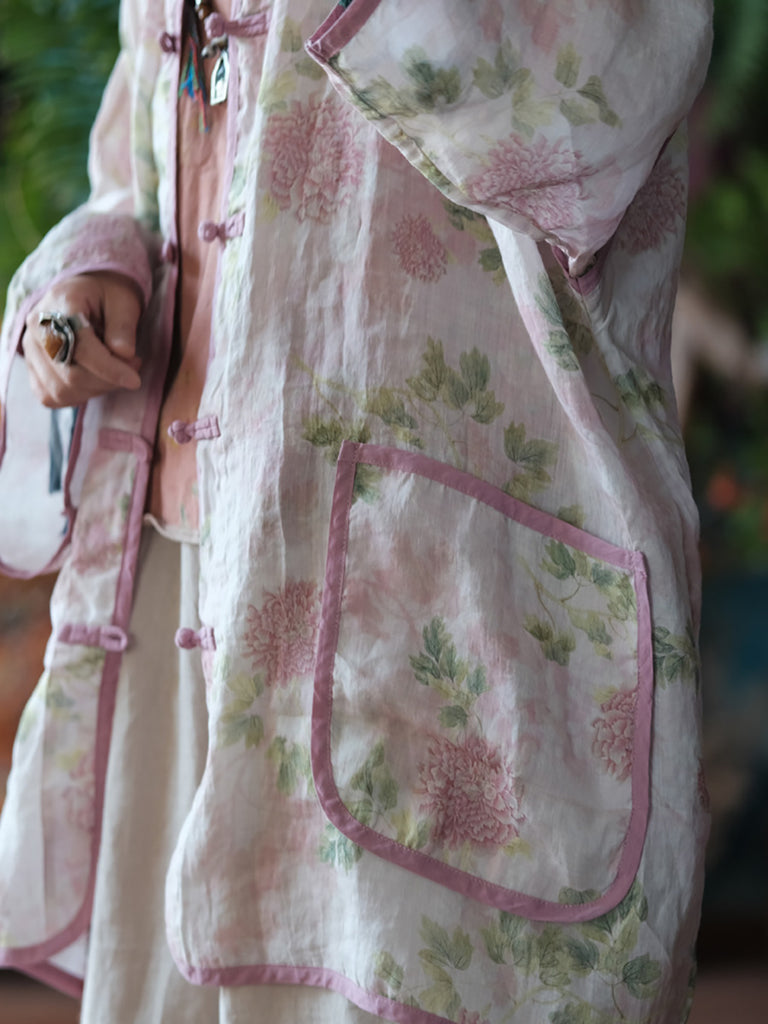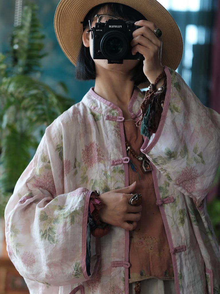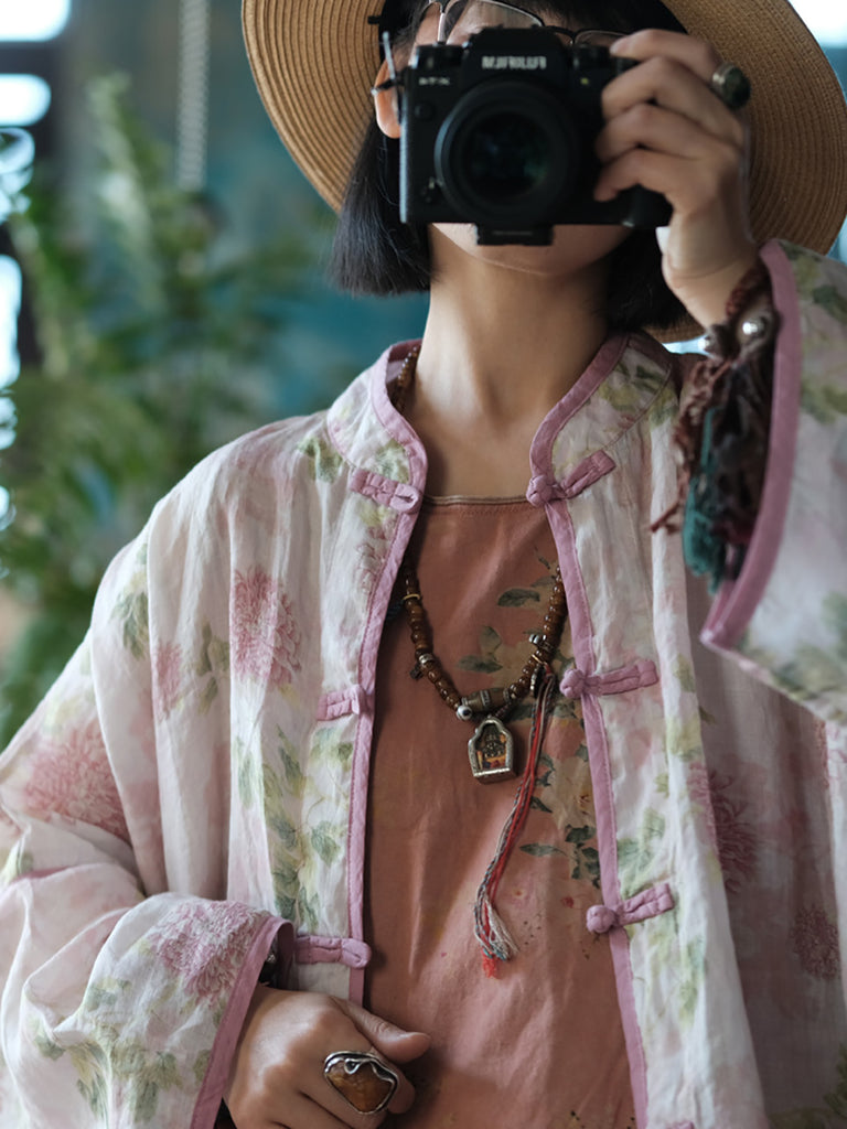 Camisa con botones florales de ramio vintage de primavera para mujer
