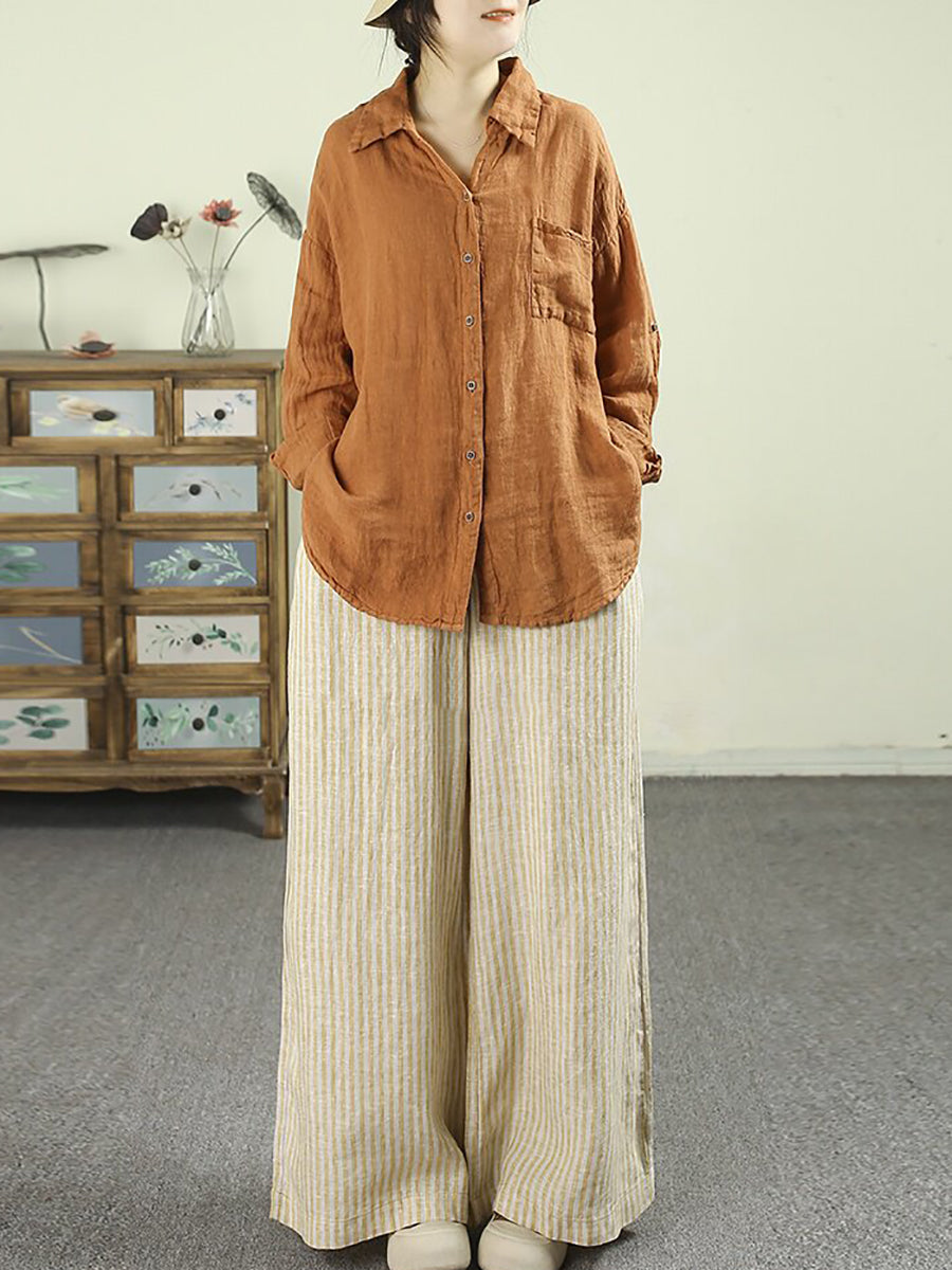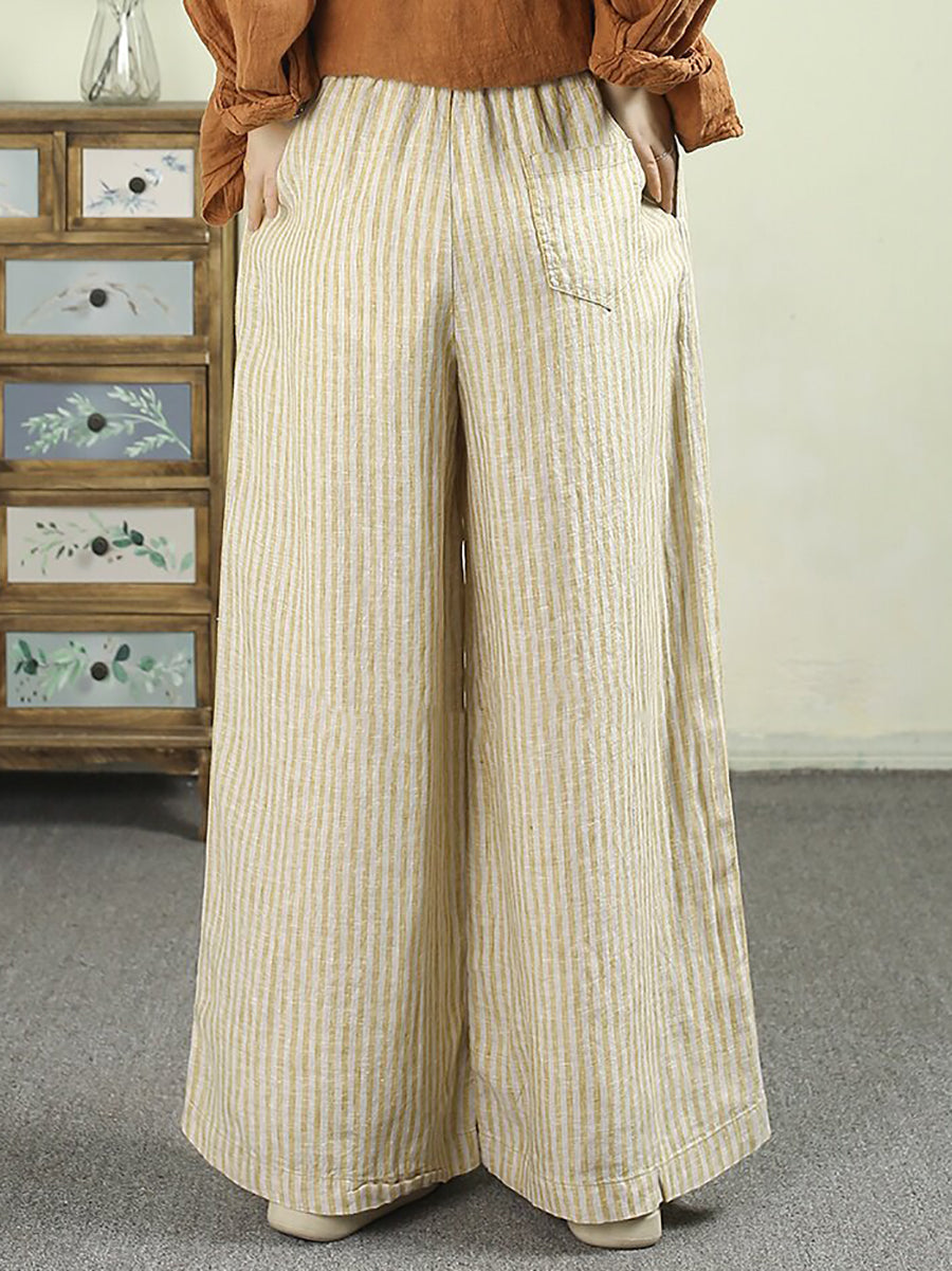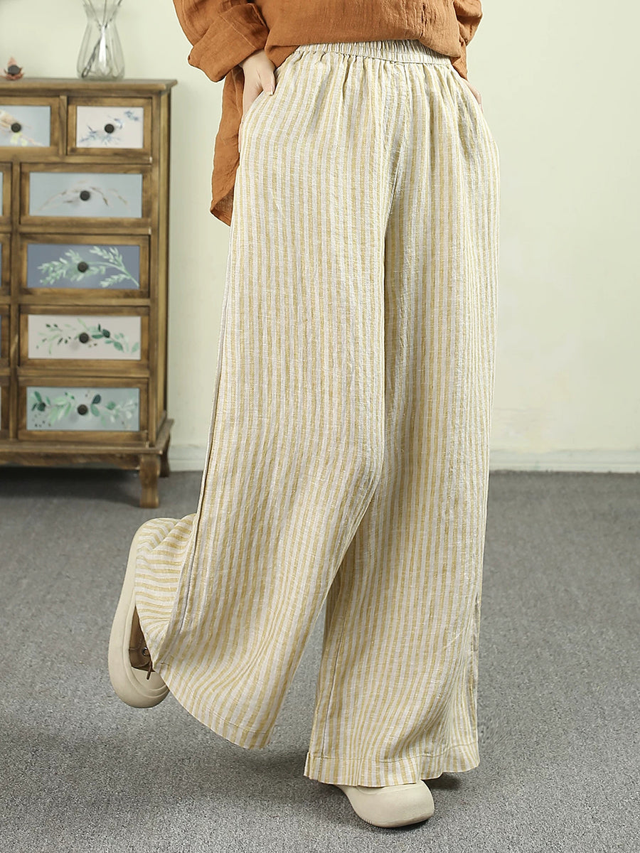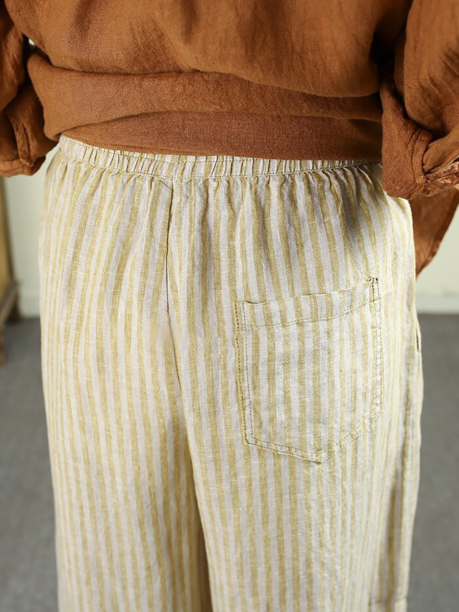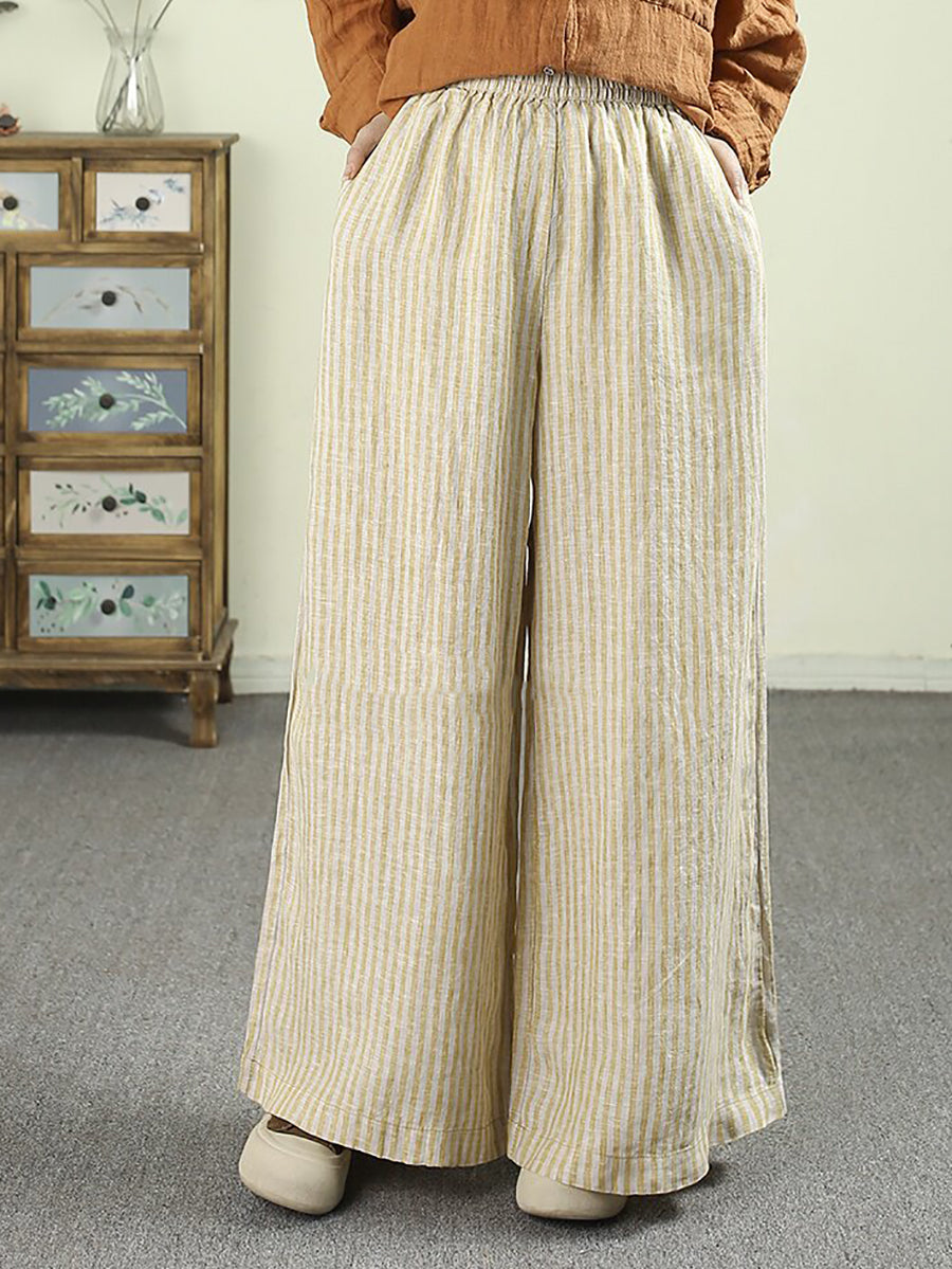 Pantalones anchos de lino 100 % con rayas vintage de primavera para mujer
